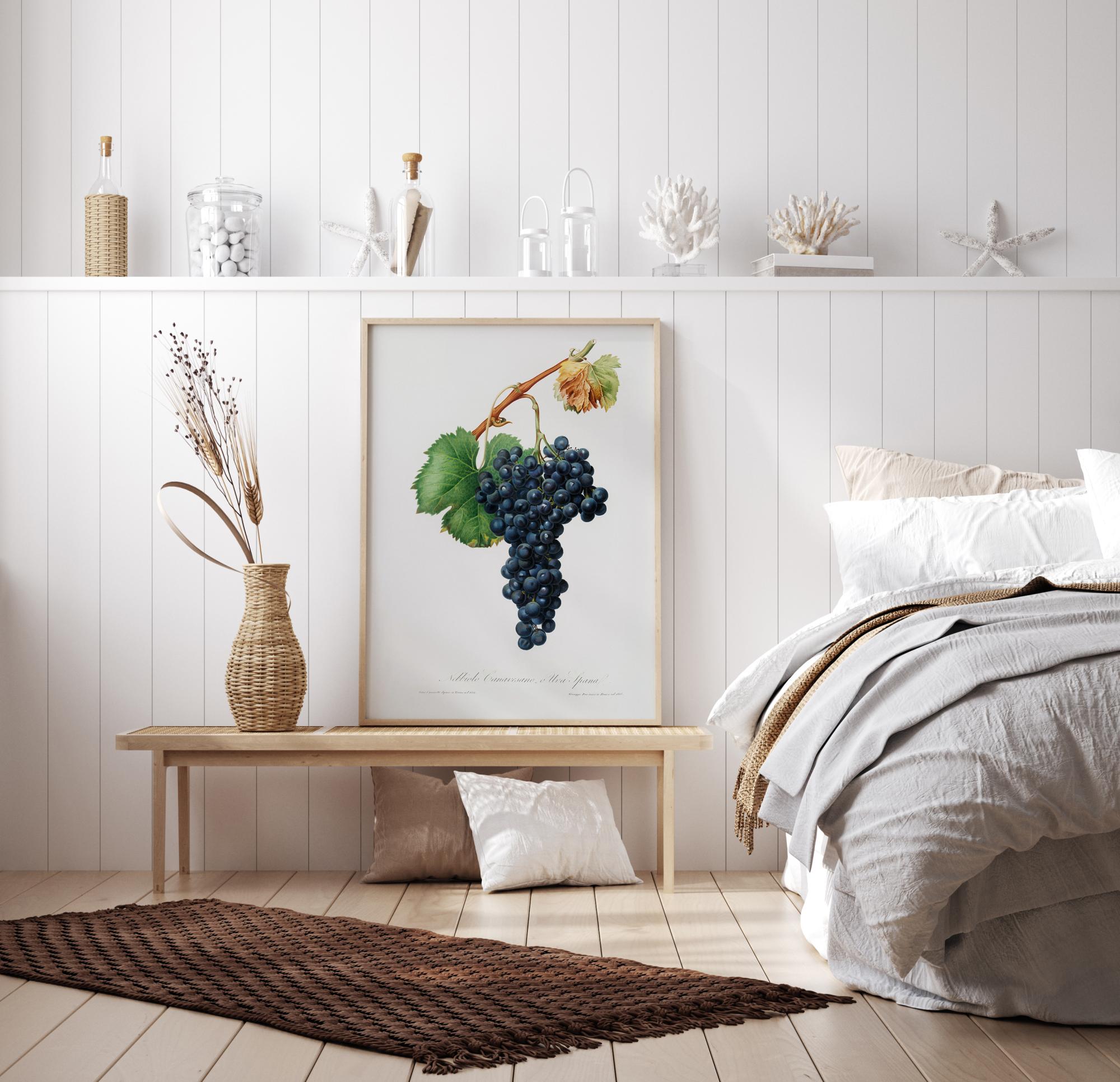 Üksikasjalik botaaniline poster, millel on palju tumedalt siniseid viinamarju viinapuuoksal, mis ripub keskel valge tausta ees. Läikivad mustsinised viinamarjad tunduvad mahlakad ja maitsvad ning ripuvad ahvatlevalt pildi keskel. Riputa see oma kööki, et saada natuke toiduinspiratsiooni.