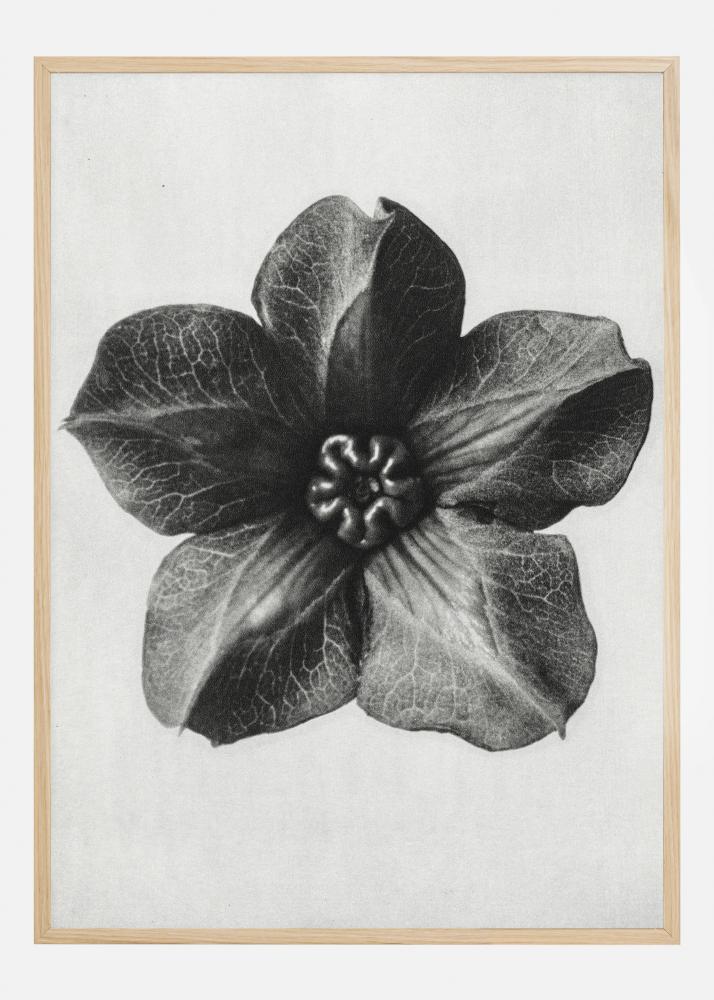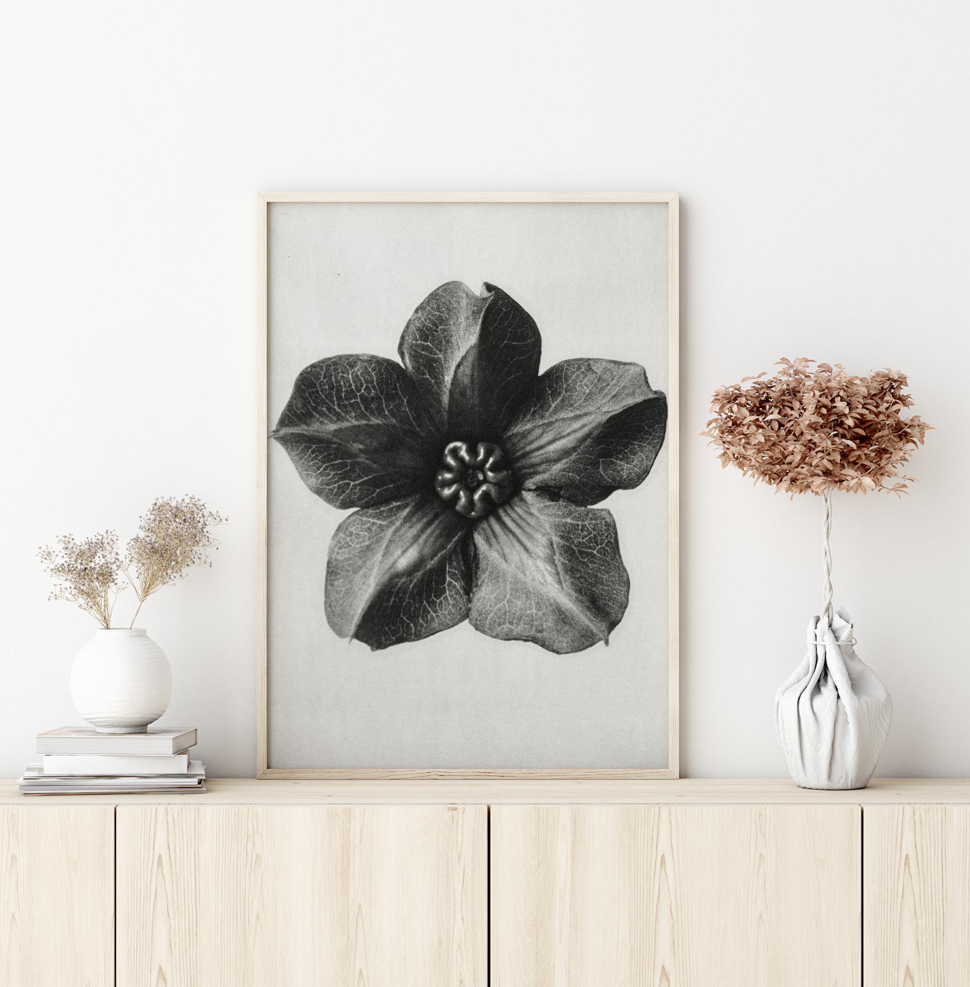 Kaunis botaaniline trükk, millel kujutatakse üksikut täies õites taime. Lihtne, kuid ilus trükk, mis on maalitud mustvalgena ja kujutab viielehelist lille. Kaunista oma sein botaanilise postriga, et luua oma kodus loomulik tunne.