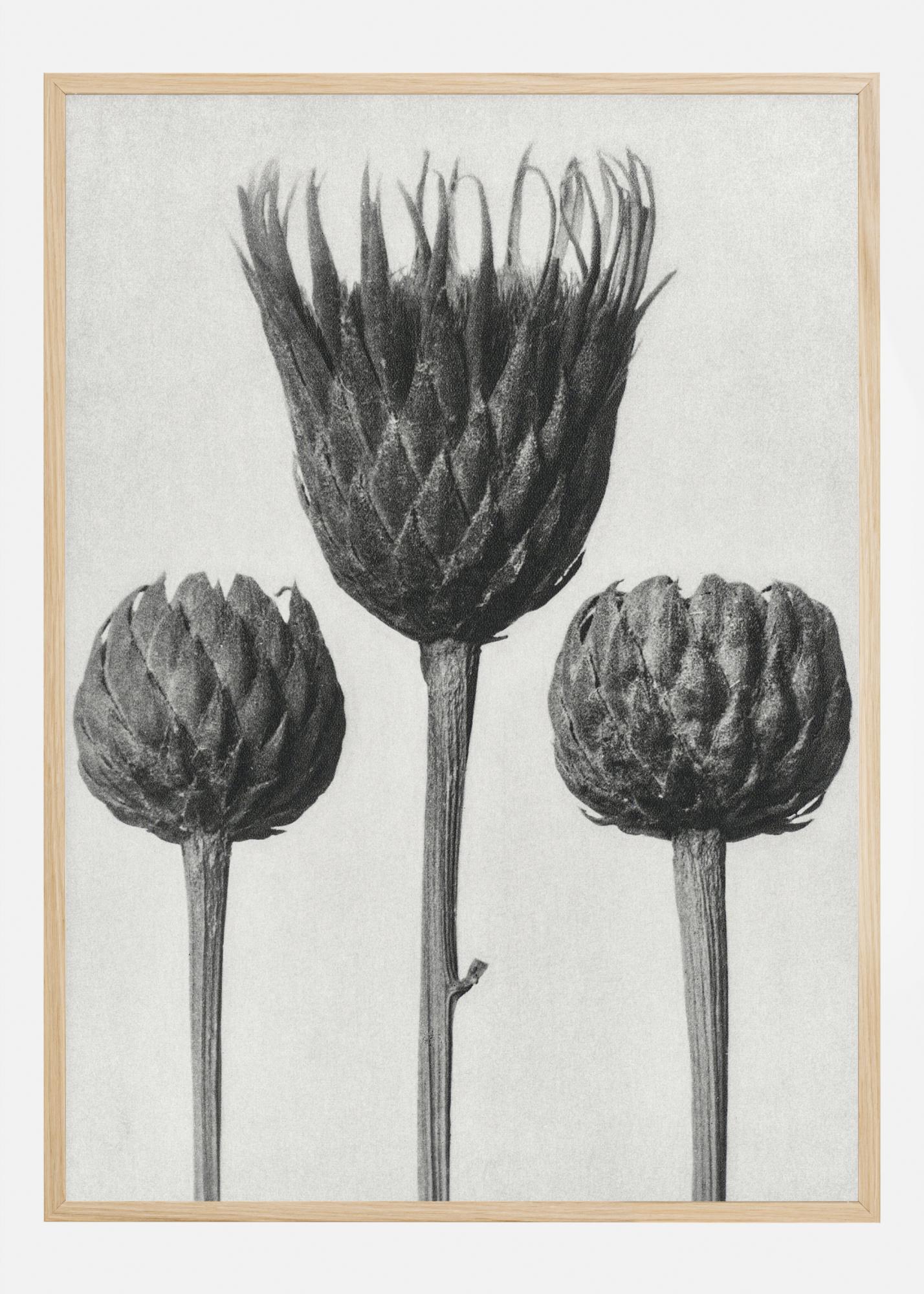 Loodusplakat kolme halli lillega, millel on üksainus vars. Kolm halli lille paiknevad valgel taustal kõrgel ja on peaaegu külg külje kõrval. Eesmine hall lill on avanud ennast rohkem kui väiksemad lilled. See on täiuslik väljatrükk, mida riputada oma talveaeda.