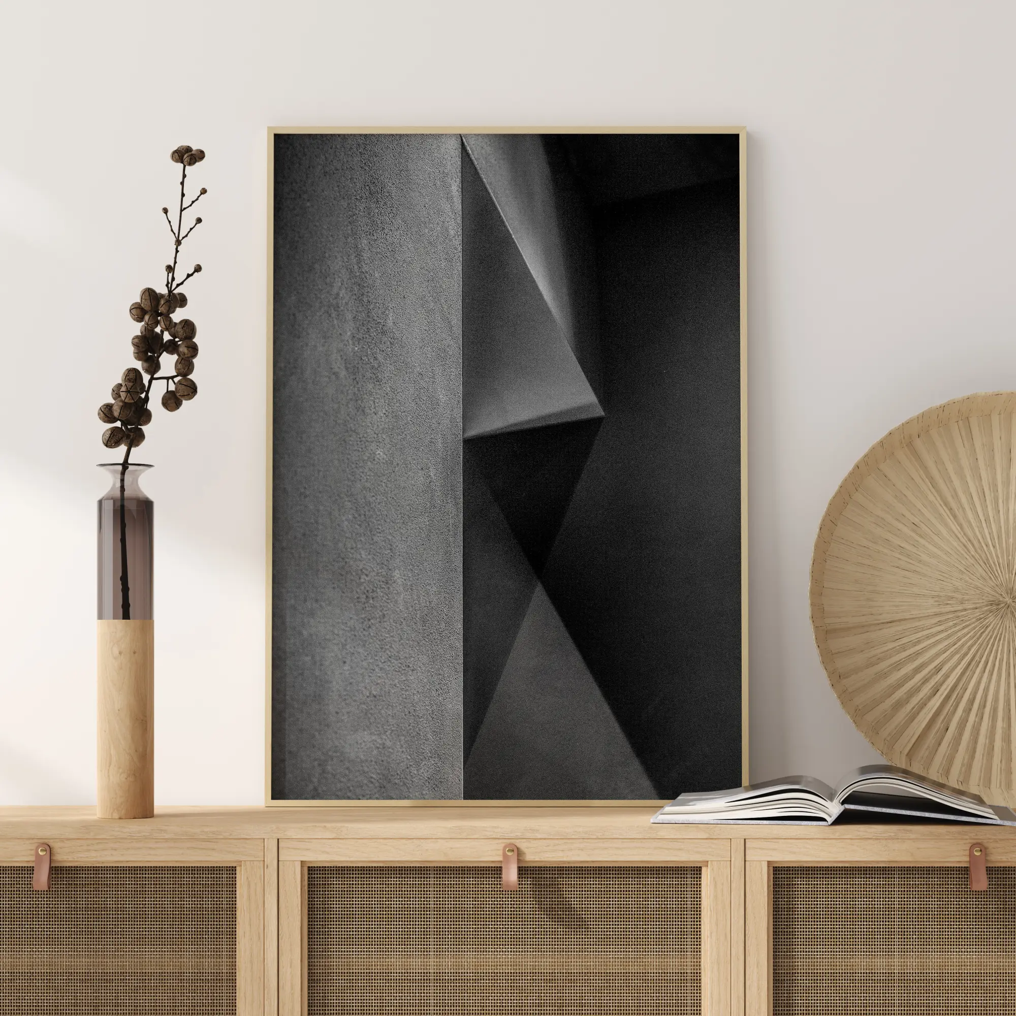 Geomeetriline plakat, mille varjud moodustavad hallid kolmnurgad. Aseta see elava värviga seinale, et tuua oma koju veidi abstraktset ekspressionismi. See trükk annab moodsale galeriitundele moodsale galeriitundele.