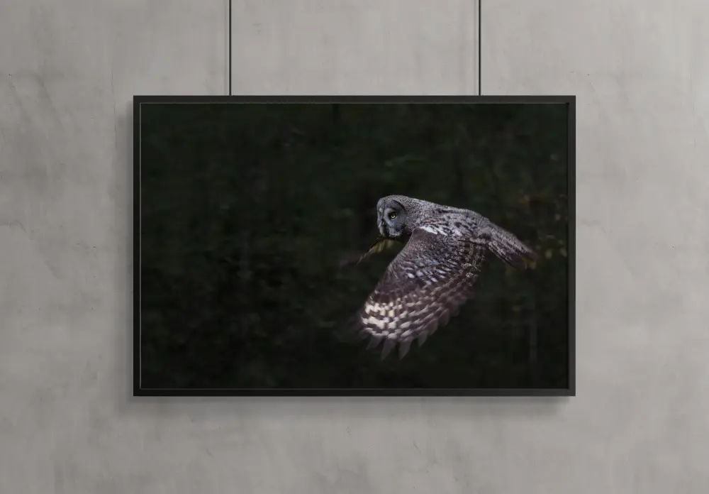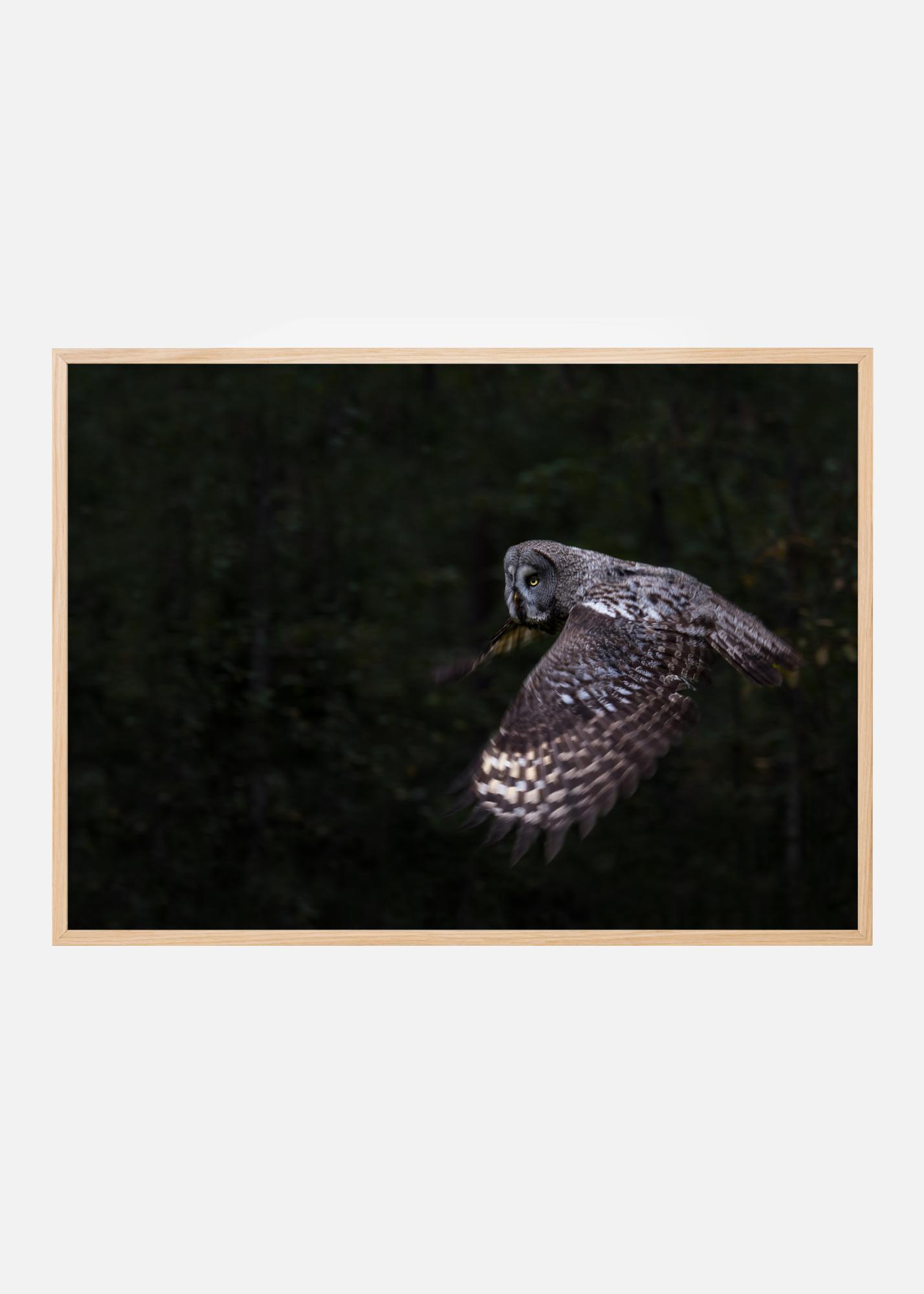 Kuninglik poster, millel on majesteetlik öökull, kes lendab hõljudes ja pingutuseta metsas. Oma laialt laotatud tiibadega võid peaaegu kuulda vaikust. Tema suured ümmargused kollased silmad vaatavad kaugusesse ja jälgivad hoolikalt saaki allpool. Tunne selle pildi jõudu, kui riputad selle prindi oma koju.