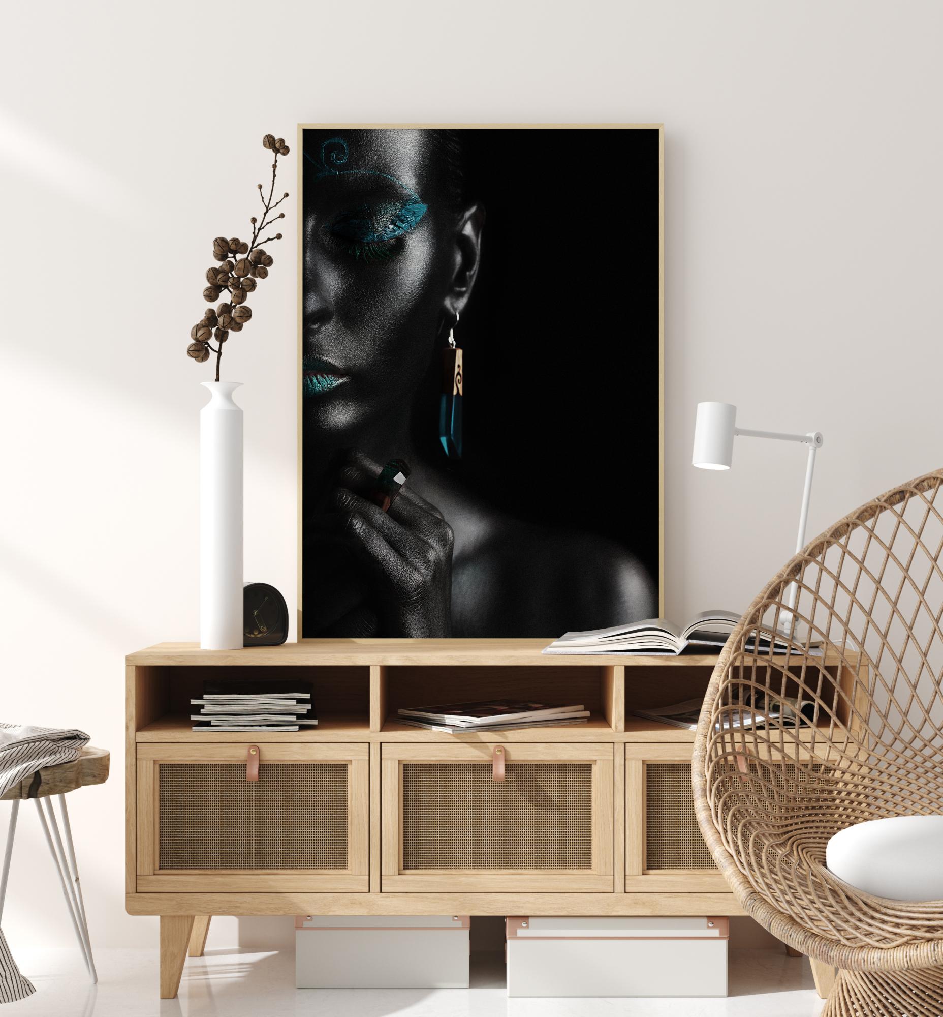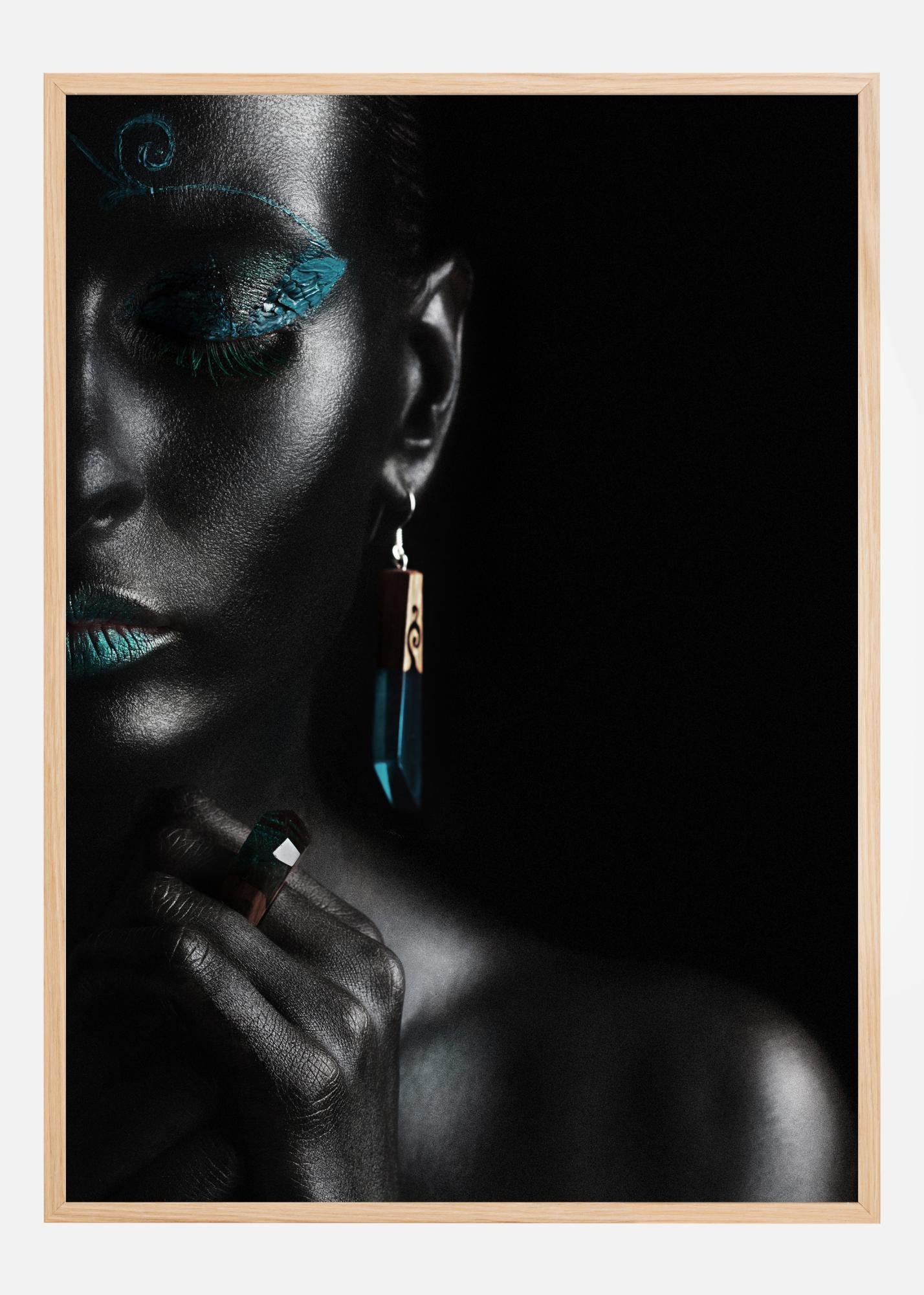 Hämmastav plakat, mis kujutab kaunist naist sügavalt oma mõtetesse süvenenult. Mustal taustal maalitud naise silmad ja suu on esile tõstetud sügava türkiissinise värviga. Aknast tulev valgus valgustab naise nägu. Valgus toob esile kõik detailid, tehes sellest täiusliku portree tühjal valgel seinal.