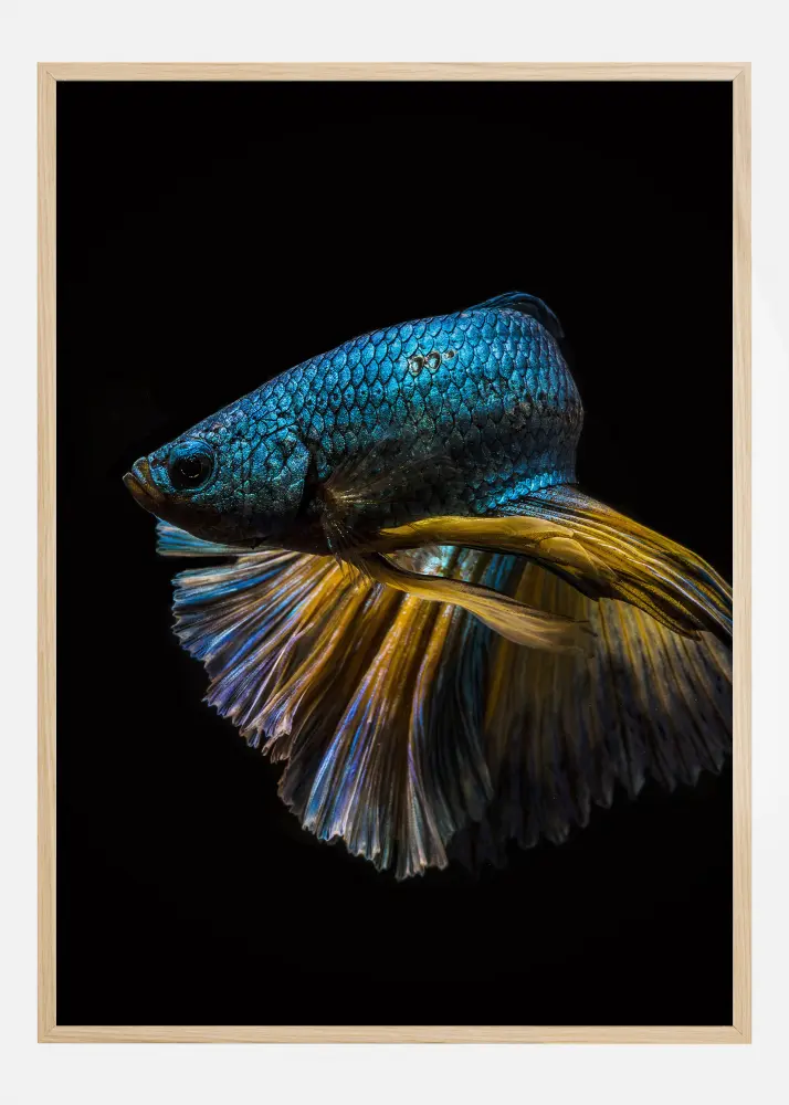 Suurepärane loodusplakat mitmevärvilise siiami võitluskalaga mustal taustal. Kui see pöörab vasakule, näitab selle mitmevärviline sabauim erinevaid värve. Riputa see kaunis trükk värvilisele seinale, et luua värvide kontrast.