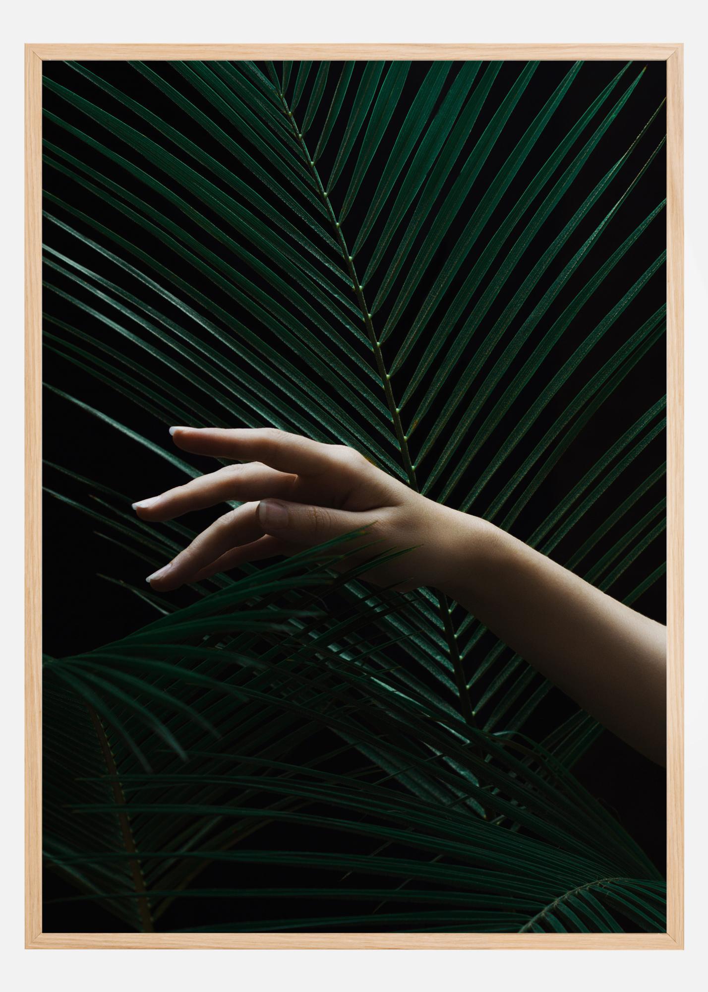 Botaaniline foto rohelistest palmi-sarnastest okstest musta tausta ees. Väljasirutatud käsi lisab elava ja kontrastse elemendi. Tume poster, mis sobib ideaalselt suuremale pildiseinale.