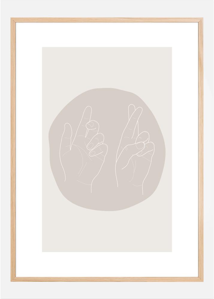 Lihtne plakat kahest vasakust käest ümara beeži kuju taustal. Ring on asetatud nahavärvi taustale, mõlemad käed osutamas plakati ülemise serva poole. Käed on lõdvestunud ning loovad sinu kodus rahuliku atmosfääri. Täiuslik pilt sinu tööruumi jaoks.