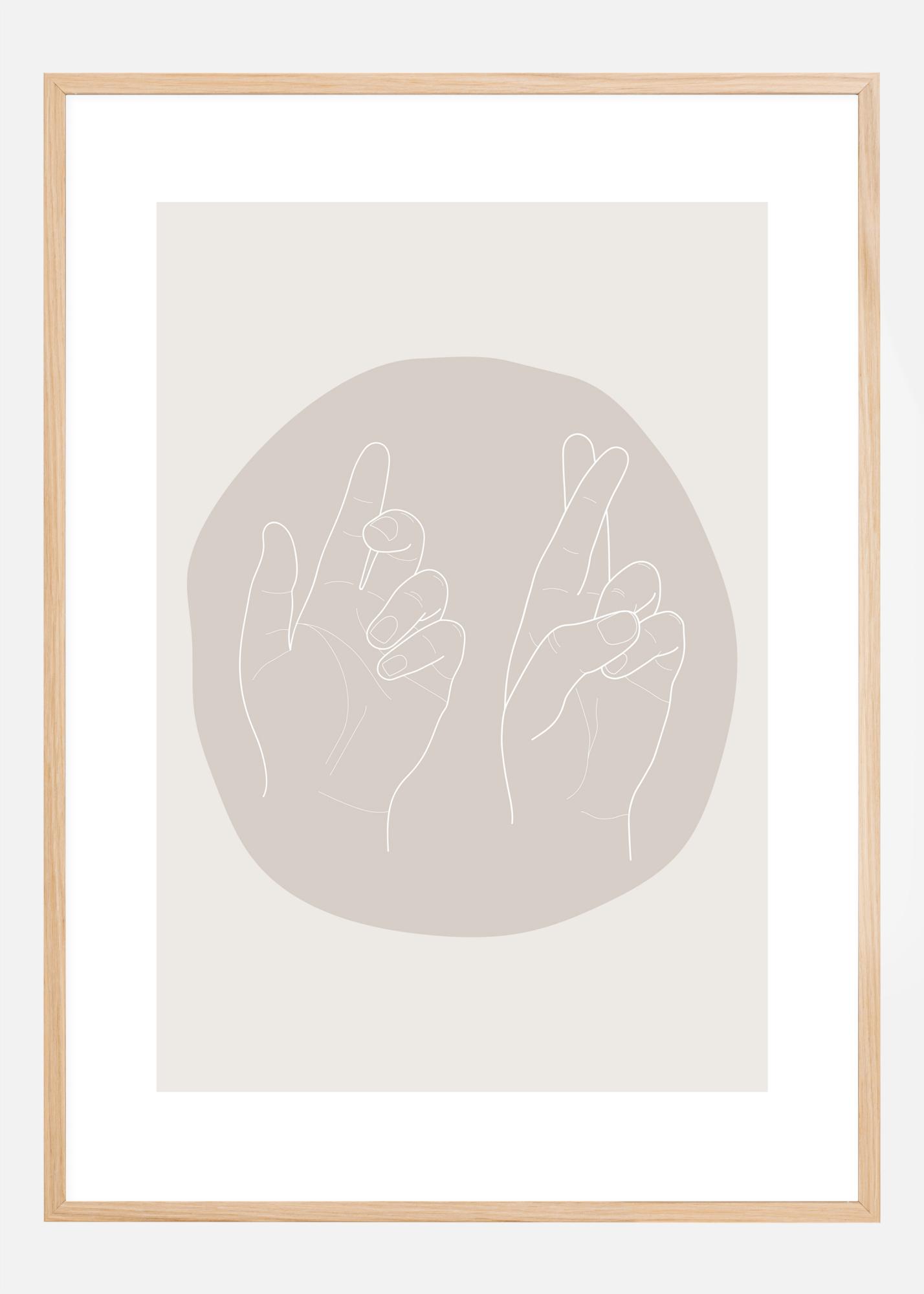 Lihtne poster kahest vasakust käest ümmarguse beeži kujundi vastas. Ring on paigutatud ihuvärvi taustale, mõlemad käed suunatud postri ülemise serva poole. Käed on lõdvestunud ja loovad rahuliku õhkkonna teie kodus. Täiuslik pilt teie töötuppa.