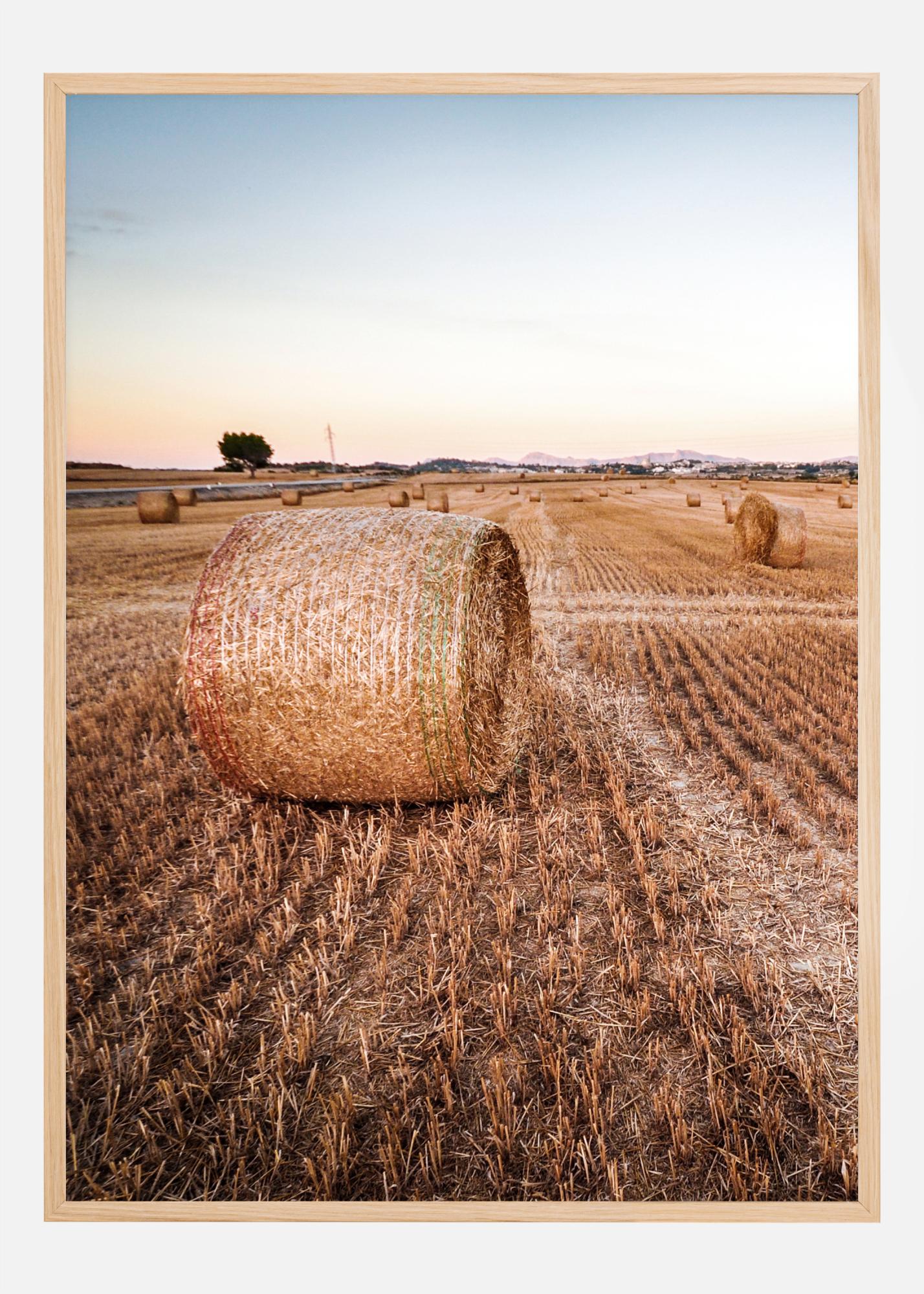 Lihtne kuid ilus loodusplakat. Esiplaanil olev heinakuhi on ilusasti kokkurullitud, samas kui kaugemal on teised kokkurullitud heinakuhjad põldudel laiali. Helesinine taevas ja soojad pruunid toonid loovad sooja ja lõõgastava pildi, mida saab riputada maamaja kööki.
