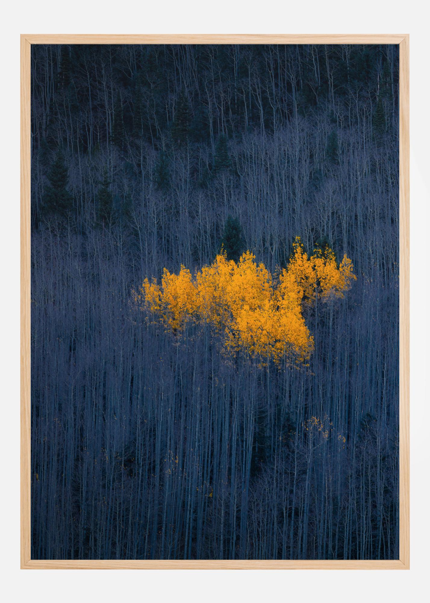 Imeline plakat, mis kujutab tumerohelist ja kesköösinist metsa. Trüki keskel on puude tipud esile toodud kollasena, mis annab trükile veidi värvi. Kaunis trükk, mida riputada elutuppa, et luua lõõgastav õhkkond.