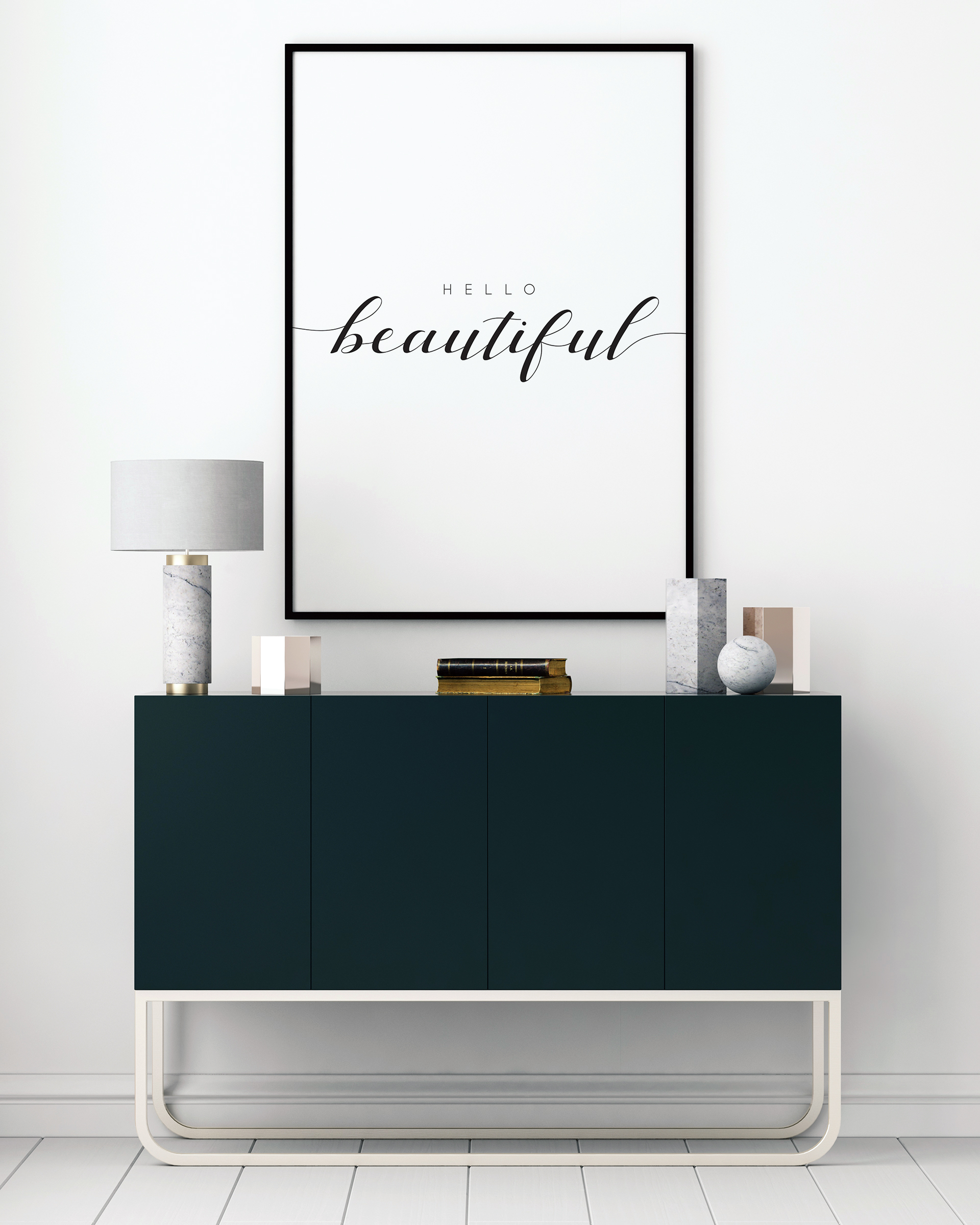 Lihtne mustvalge plakat, millel keskel on kaks sõna. Sõna "Hello" on väiketähtedega, samas kui sõna "Beautiful" köidab meie tähelepanu oma suuruse ja elegantsete tähtede tõttu. Äärmiselt võimas pilt, mida riputada lastetoa seinale.