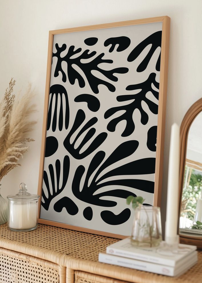 Seda moodsat postrit iseloomustavad abstraktsed vormid stiilses, minimalistlikus võtmes. Kujundil on mustad orgaanilised vormid heleda beeži taustal, mis loob tugeva, kuid samas elegantse kontrasti. See plakat sobib suurepäraselt neile, kes soovivad oma ruumi täiendada modernse ja puhta ilmega. Ideaalne kombineerimiseks teiste printidega, et luua harmooniline galeriisein.