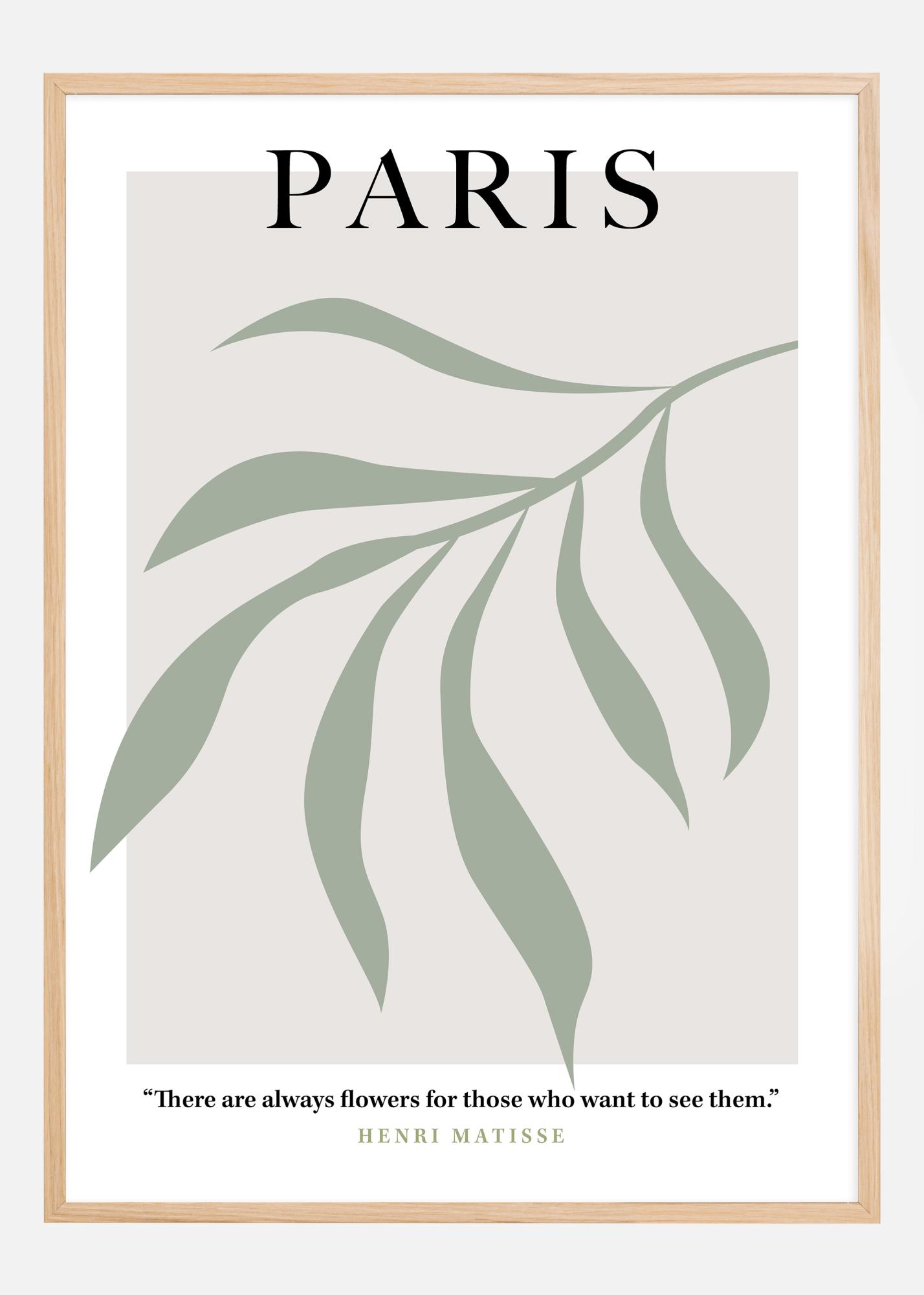 Selle stiilne ja elegantne plakat kannab sõna "PARIS" suurte tähtedega, pehme roheliste joonte taustal, mis moodustavad abstraktse, orgaanilise vormi, meenutades rahulikke ja jahedaid aedu. Selle mahe palett loob rahu ja peene elegantsi tunde, mis peegeldab linna mainet ilu ja kultuuri keskpunktina. Sellele lisab inspiratsiooni Henri Matisse'i tsitaat, mis annab plakatile kunstilise tarkuse sügavuse: "Alati on lilli neile, kes tahavad neid näha."
