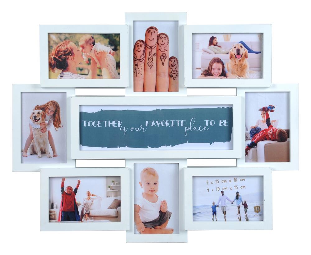 Koguge oma parimad fotod stiilsesse kollaažraami! See raam ei ole mitte ainult kena vaadata, vaid seda saab ka ümber kujundada! Kaasas on nimelt 5 armsat teksti erinevatel teemadel, mida saate paigutada keskmesse (9.) raami ja vahetada välja, kui soovite. Näiteks võite panna tekste nagu "Kõik, mida vajate, on armastus" või "Öelge jah perele". Kollaažraami saab osta musta ja valget värvi.