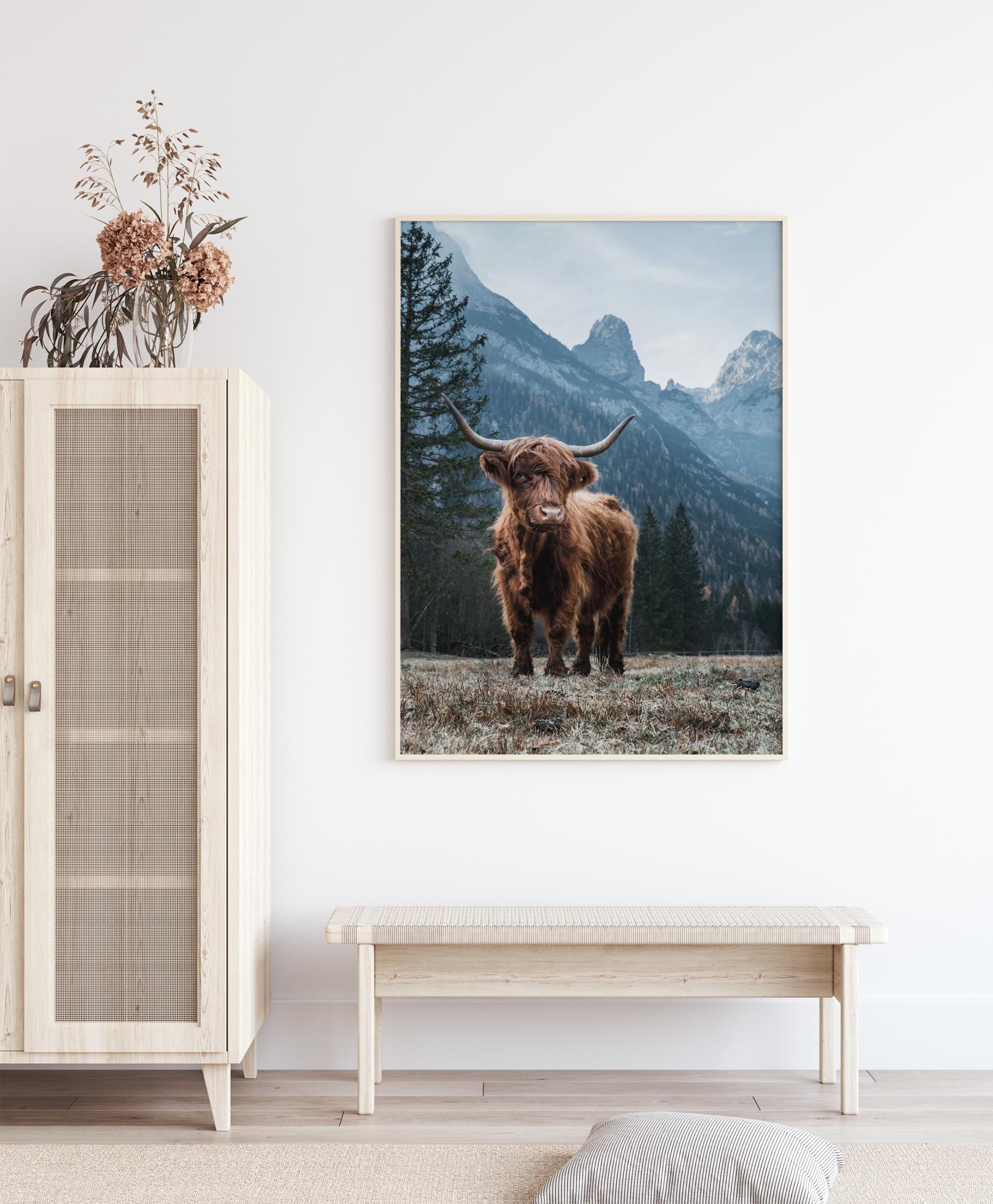 Metsik plakat punakaspruunist mägiveisest, kes seisab üksinda põllul. Lumega kaetud järsud mäed raamivad selle kauni looma. Oma lühikese, koheva karvkattega, mis talub karmides tingimustes, ei tundu loom millegi pärast muretsevat. Kasuta oma kujutlusvõimet ja kujutle end Šoti nõmmedel.