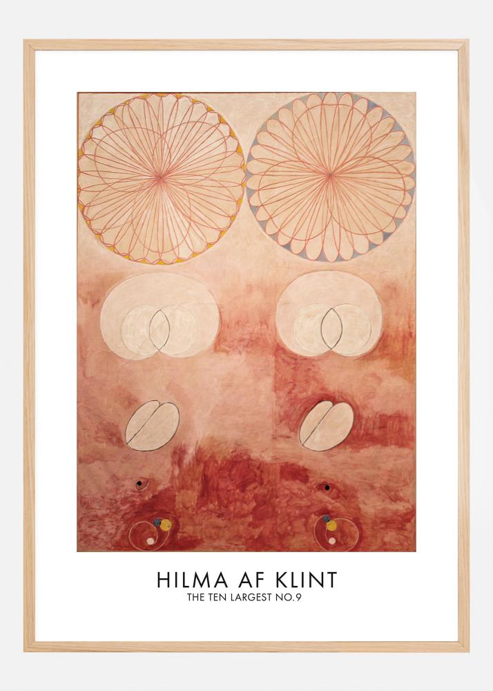 See plakat 'The Ten Largest No.9' Hilma af Klintilt on hüpnotiseeriv segu geomeetriast ja orgaanilistest vormidest, mis illustreerivad kunstniku kosmilist ja vaimset lummust. Kaks domineerivat ringi, täidetud kiirgavate joontega sooja roosa ja terra-cotta taustal, loovad kohese visuaalse külgetõmbe. Nende all on väiksemate ringide ja spiraalsete vormide rida, mis lisavad kompositsioonile sügavust ja keerukust. See kunsttrükk on af Klinti võime teadus ja vaimsus ühte pildivälja koondada, pakkudes avatud väljakutse vaataja omaks tõlgendance ja sisemisteks uurimisteks.