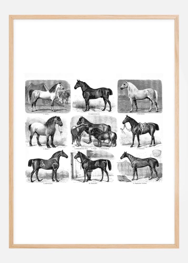 Kas sa ei saa hobustest küllalt, siis on siin kaunis plakat, millel on kujutatud erinevaid hobuse tõuge. Iga pildi all leiad tõugude nimed inglise keeles. Kuna plakat on mustvalge, on seda lihtne kombineerida ilusa värviga raamiga. Plakat on saadaval mitmes erinevas suuruses, mis sobivad nii kummutile asetamiseks kui ka seinale riputamiseks.