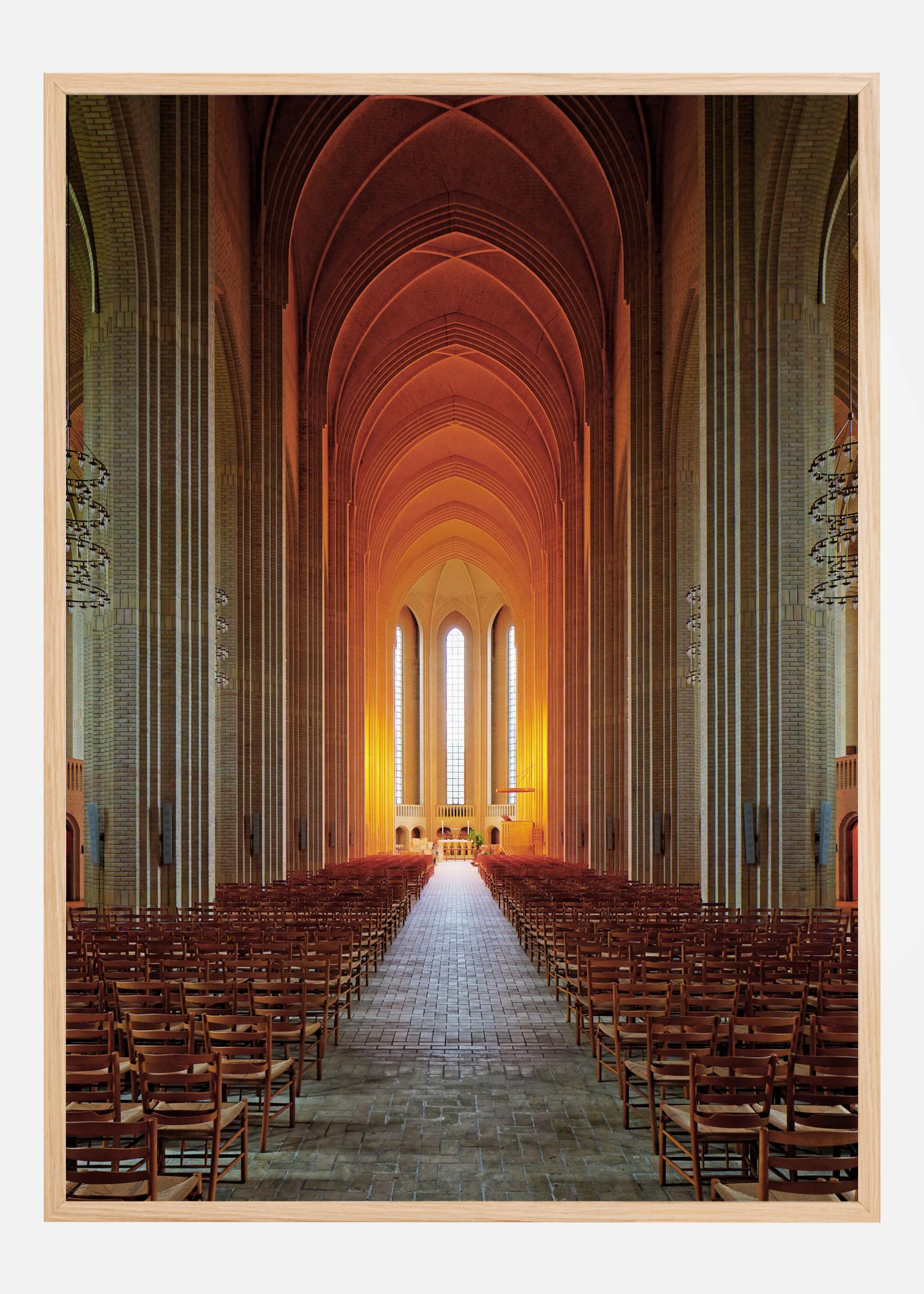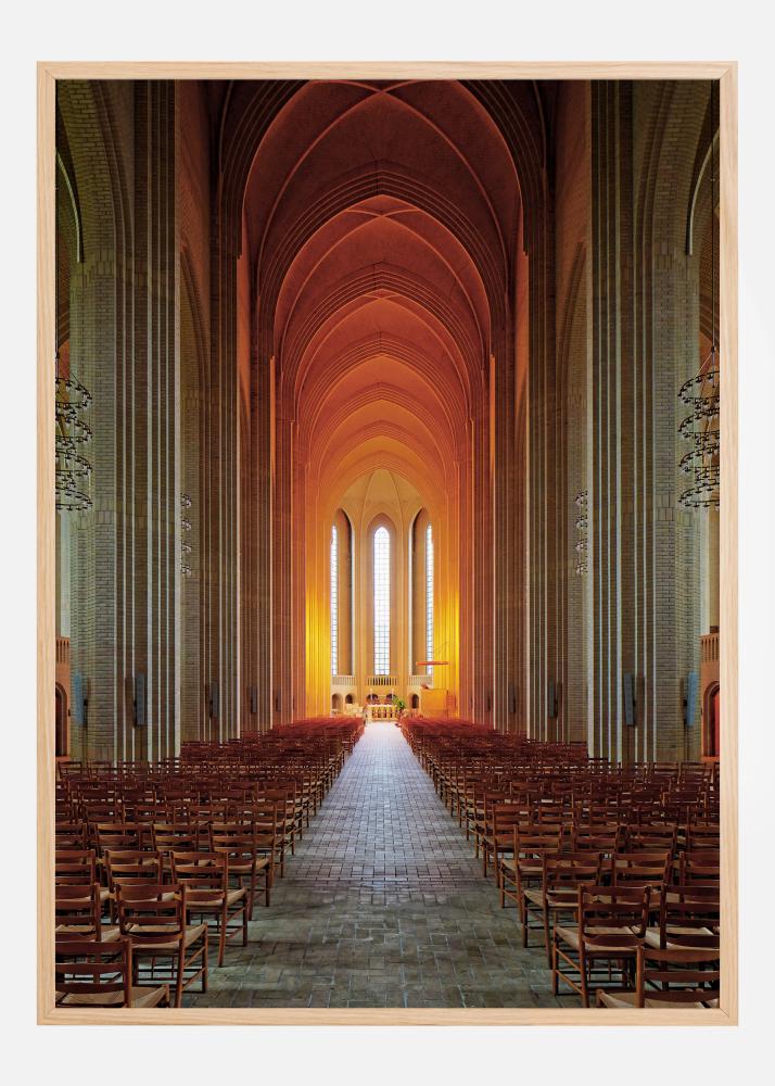 Hingemattev arhitektuurne plakat kirikus. Pikk kirikusaal viib altari juurde ja kõrge lagi ning kivikolonnid loovad väga rahuliku tunde. Apelsinikarva valgus peegeldub läbi akende ja tekitab soojuse ja harmoonia tunde. Kogege selle pildiga rahulolu.