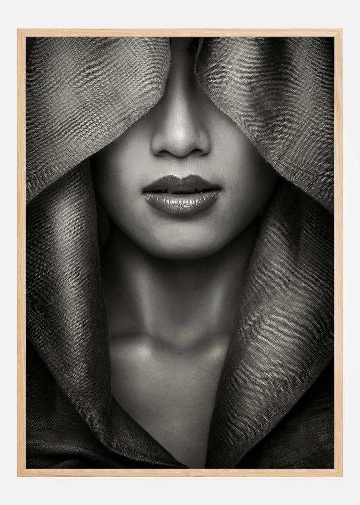 Pilt kujutab võimsat ja haaravat lähivõtet isikust, kes on riietatud kangasse, keskendudes rõhutatud huultele ja tugevale lõuajoonisele. Kanga detailne tekstuur ja naha pehmed varjud lisavad sügavust ja keerukust, mis tõmbab vaatleja motiivi sisse. Monokroomne palett rõhutab iga detaili ja loob ajatu tunde.