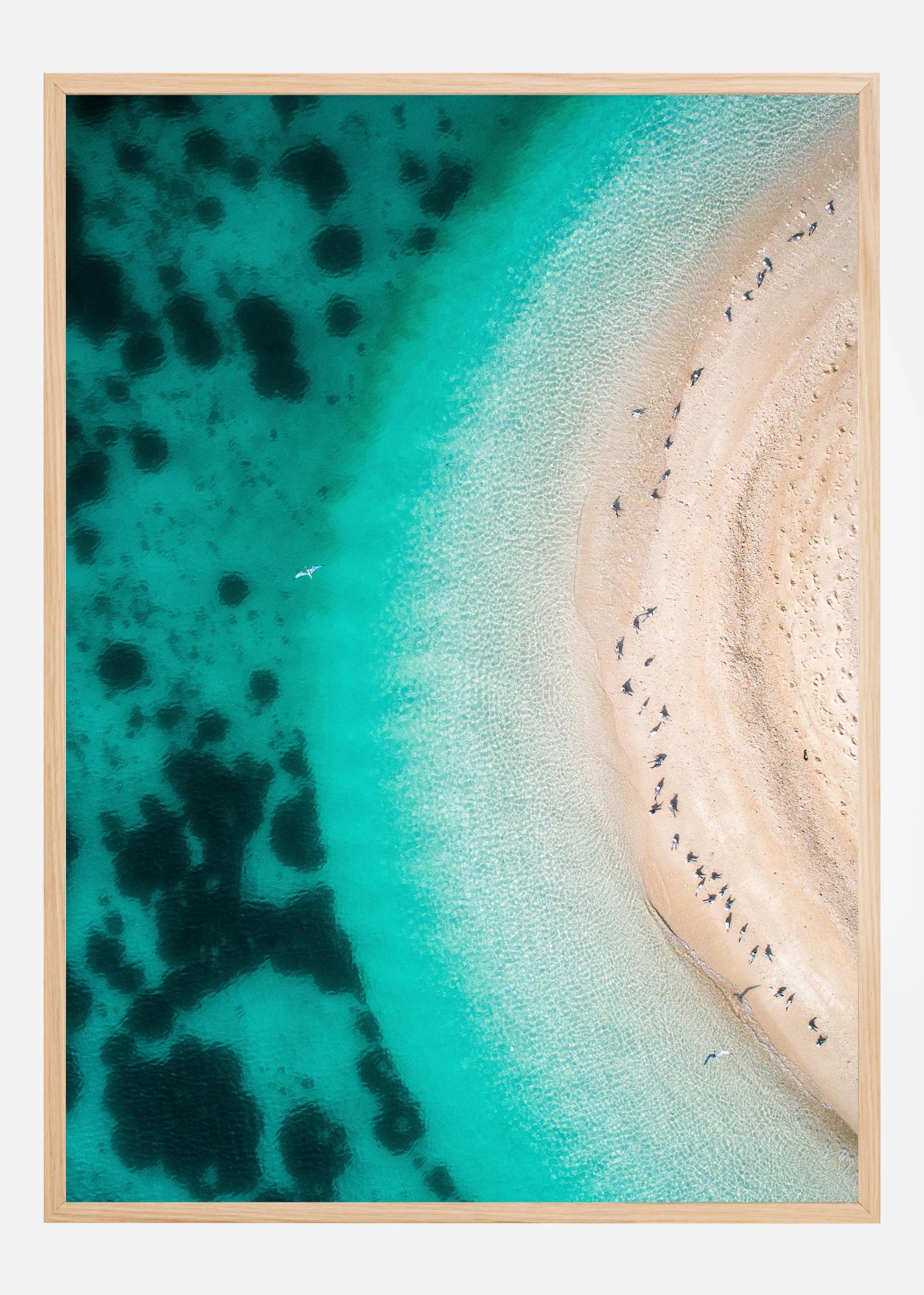 Ilmavaatlus kauni rannajoone kohal. Suurepärane türkiissinine meri sulandub ideaalselt roosaka liivaga. Tumedad kivid merepõhjas annavad sellele suurepärasele prindile värvi lisamõõtme. Kujutage ette, et olete juba täna sellel rannal.