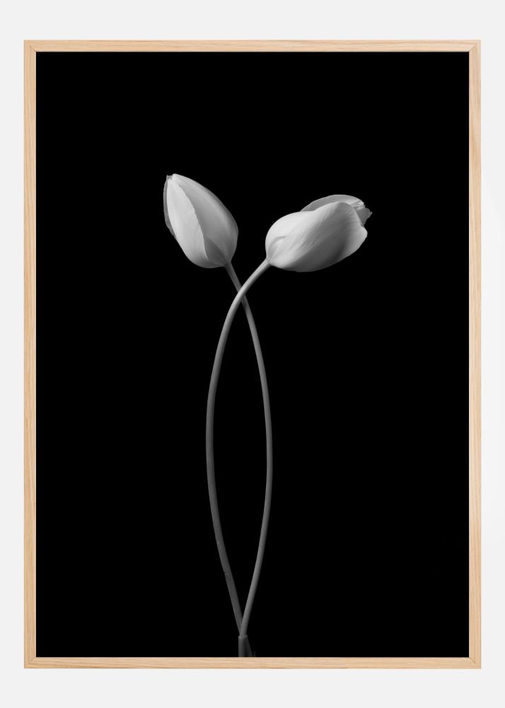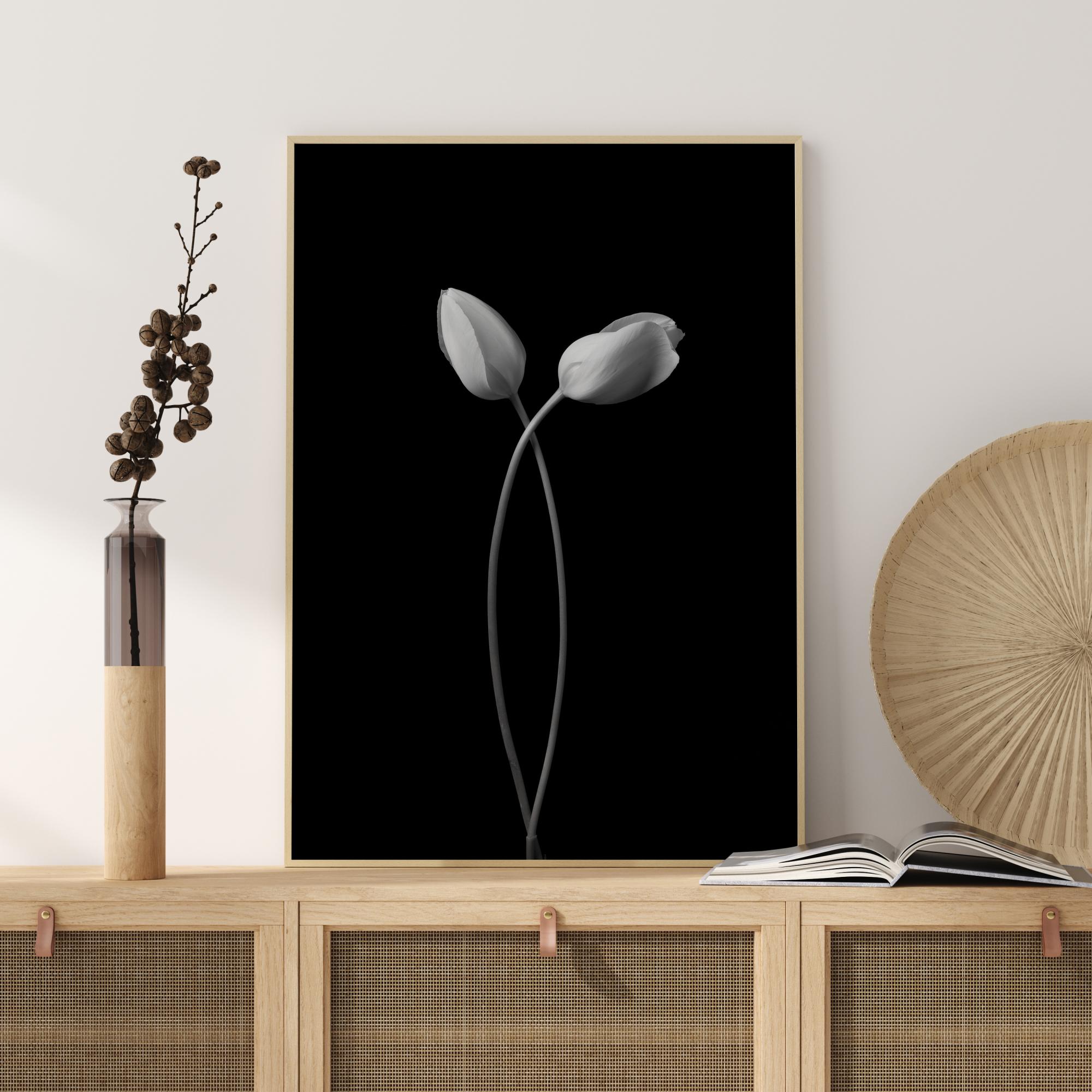 Elegantne plakat kahe tulpiga, mis embavad tavalise musta tausta ees. Asetage see kollasele seinale, et sellele dramaatilisele stseenile värvi lisada. Tunne sidet loodusega selle plakatiga.