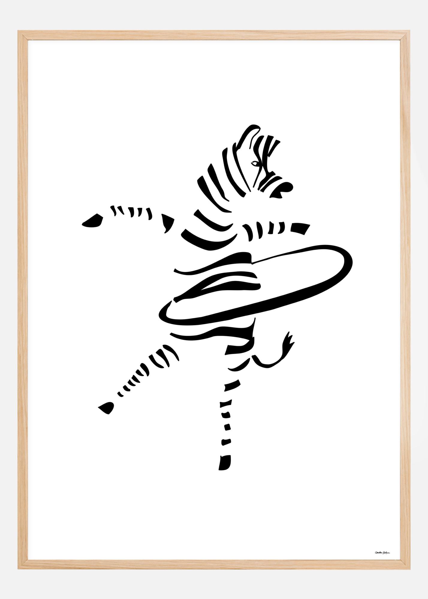 Minimalistlik tantsiva sebra portree. Valgel taustal moodustavad mustad pintslitõmbed oskuslikult sebra kuju. See armas sebra seisab tagajalgadel ja tantsib rõngaga. Lihtne, kuid lõbus poster, mida riputada lihtsale seinale.