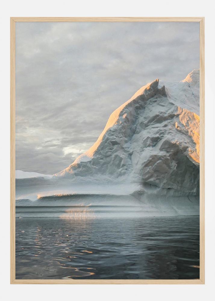 See hingematte poster peegeldab jäämäge sügavas, külmas meres pilvise halli taeva taustal. Väike lumega kaetud mägi on osaliselt päikesevalguse poolt valgustatud. Kristallsinine meri virvendab õrnalt esiplaanil ja loob rahuliku pildi. Täiuslik pilt, mida riputada oma talumaja kamina kohale.