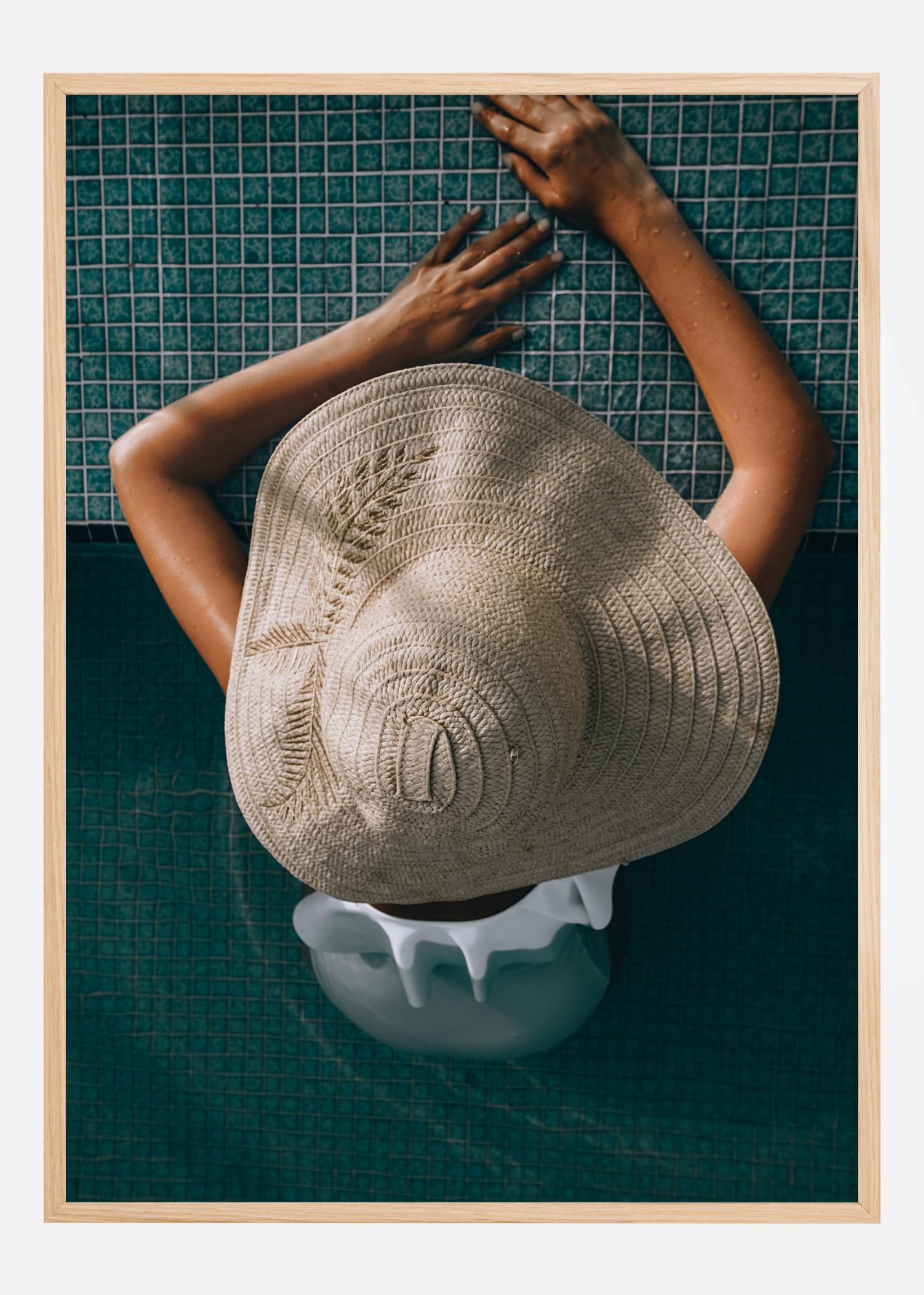 See lõõgastav ja elegantne plakat jäädvustab rahuliku hetke basseini ääres, kus inimene kannab laia äärega mütsi ja puhkab veepiiril. Unikaalne vaade ülalt ja rahustav sinine mosaiiktaust annavad luksusliku kerguse ja rafineerituse tunde. See pilt on imeline sisustusdetail, et luua teie kodus rahu ja lõõgastuse oaas.