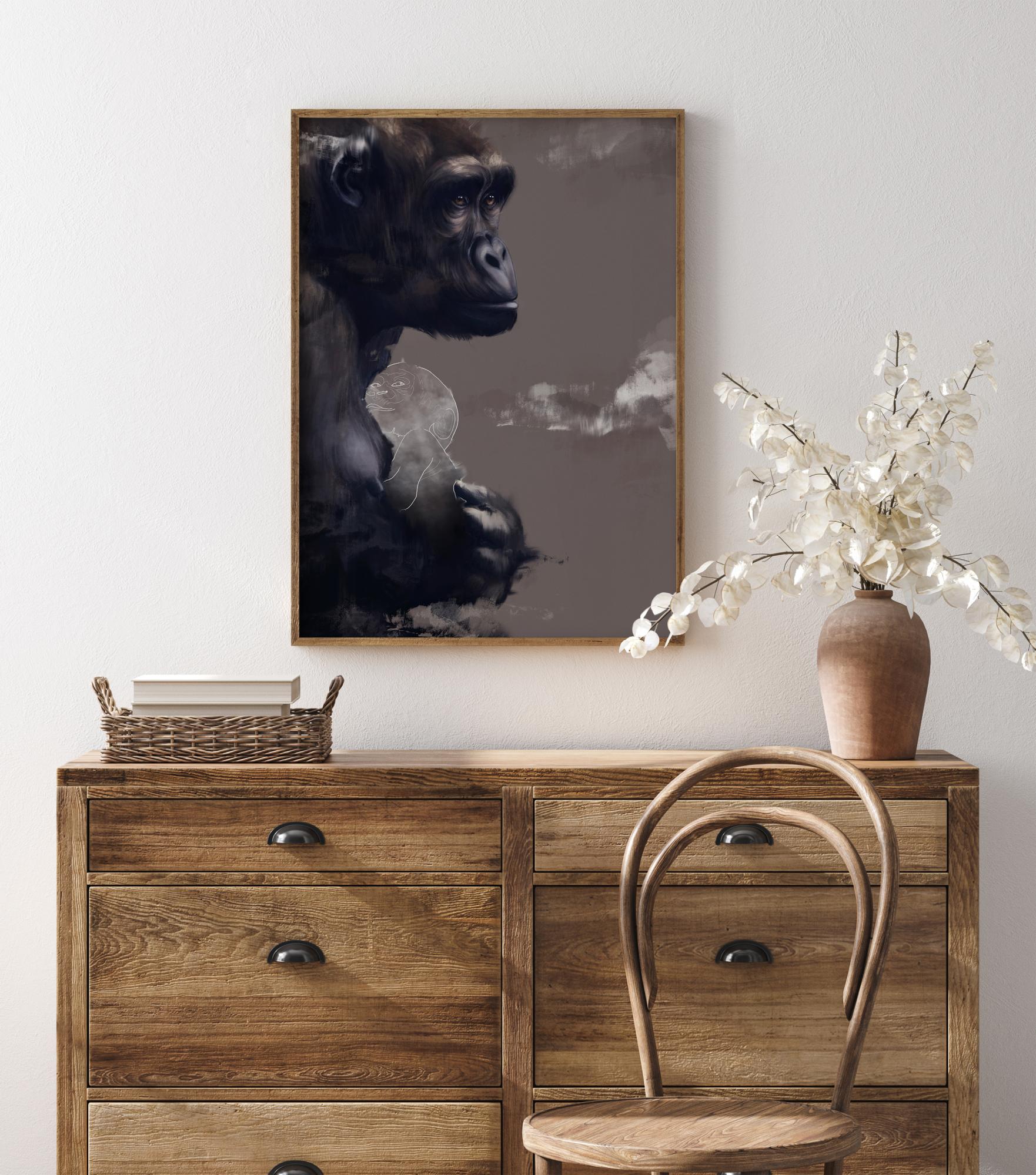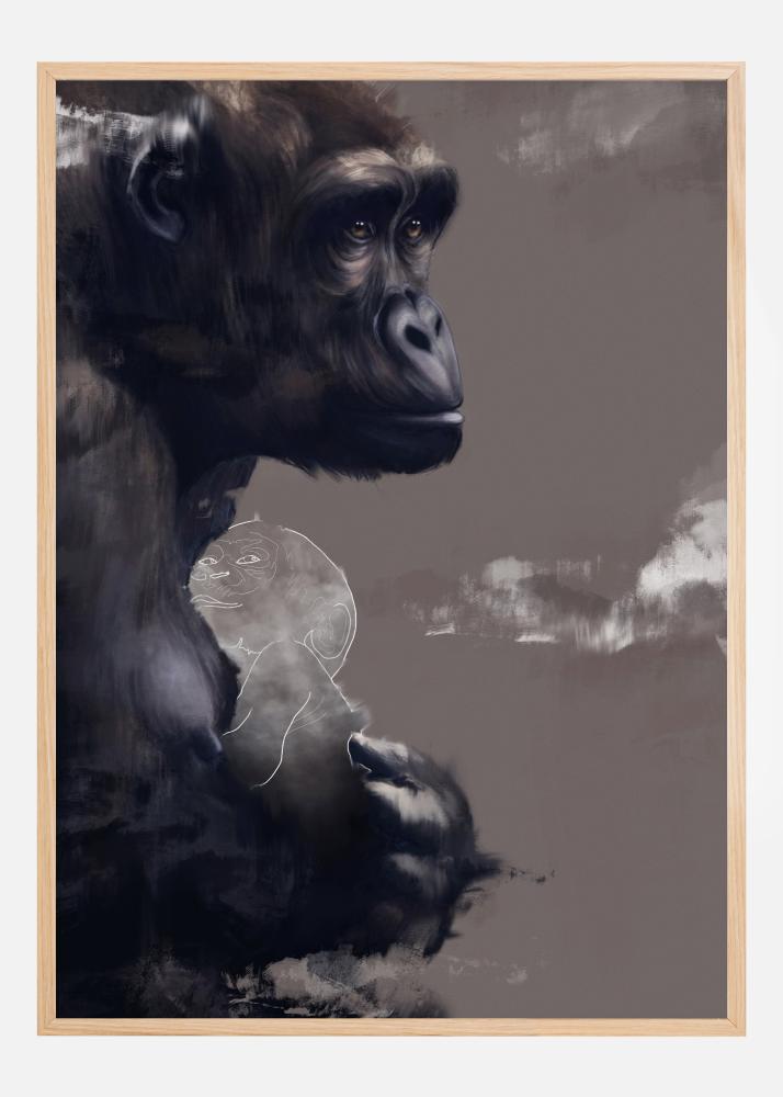 Kirgas loodusplakat koos gorillaga, kes hoiab oma vastsündinud last. Helepruunil taustal näitab see jõuline primaat võimsat, kuid siiski õrna emainstinkti. See pilt gorillast, kes kaitseb vastsündinud last oma armastavates kätes, on ideaalne trükis kõigile loomaarmastajatele.
