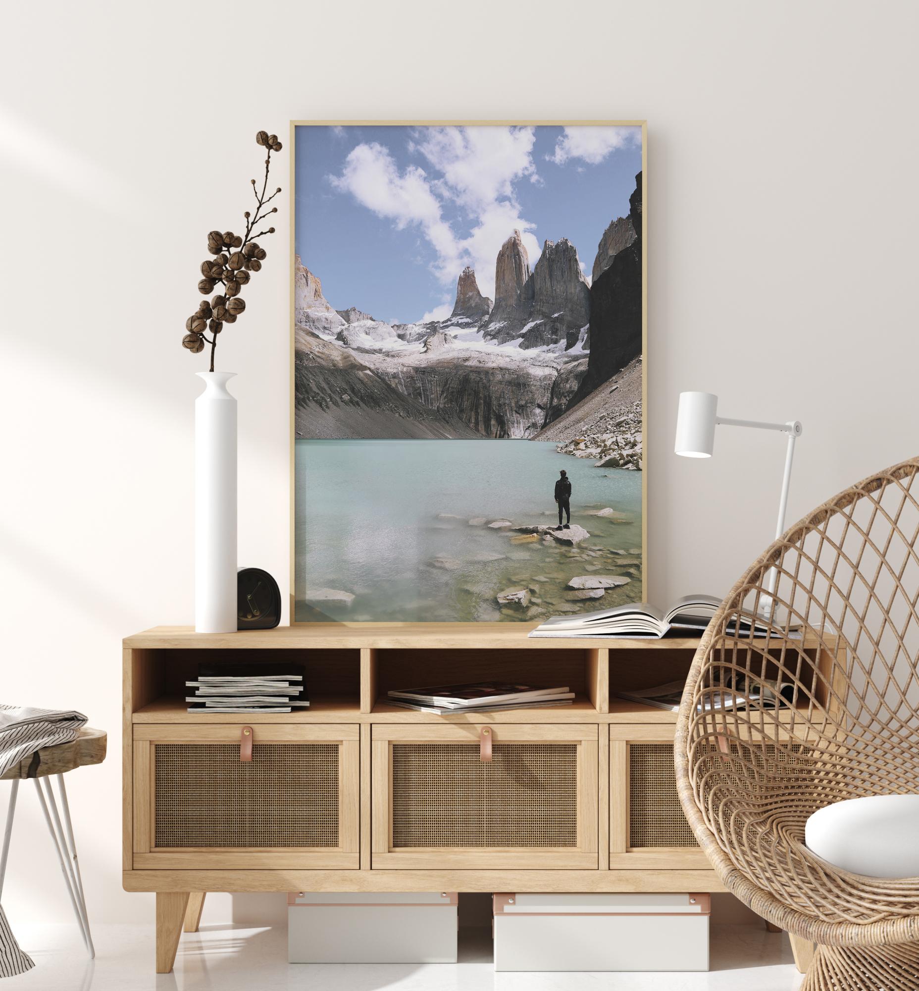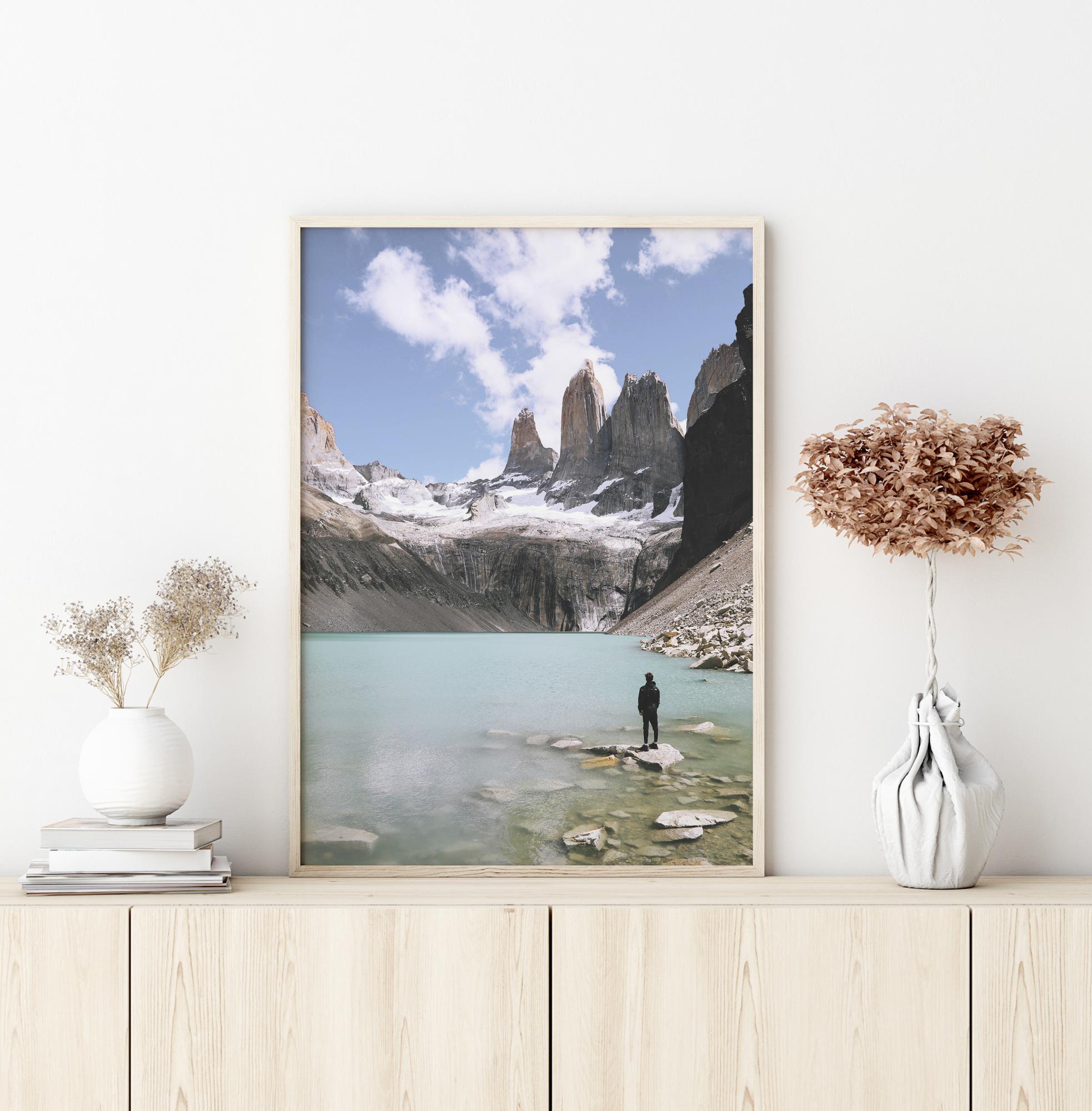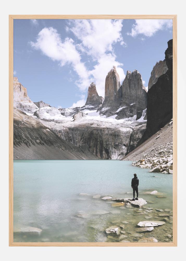 Looduse plakat üksiku figuuriga, kes jälgib hingematvat ümbrust. Seistes kivi peal järve ääres, ümbritsevad muljetavaldavad lumega kaetud mäed türkiissinise järve. Sa peaaegu et tunned selle maagilise pildi jahedat õhku.