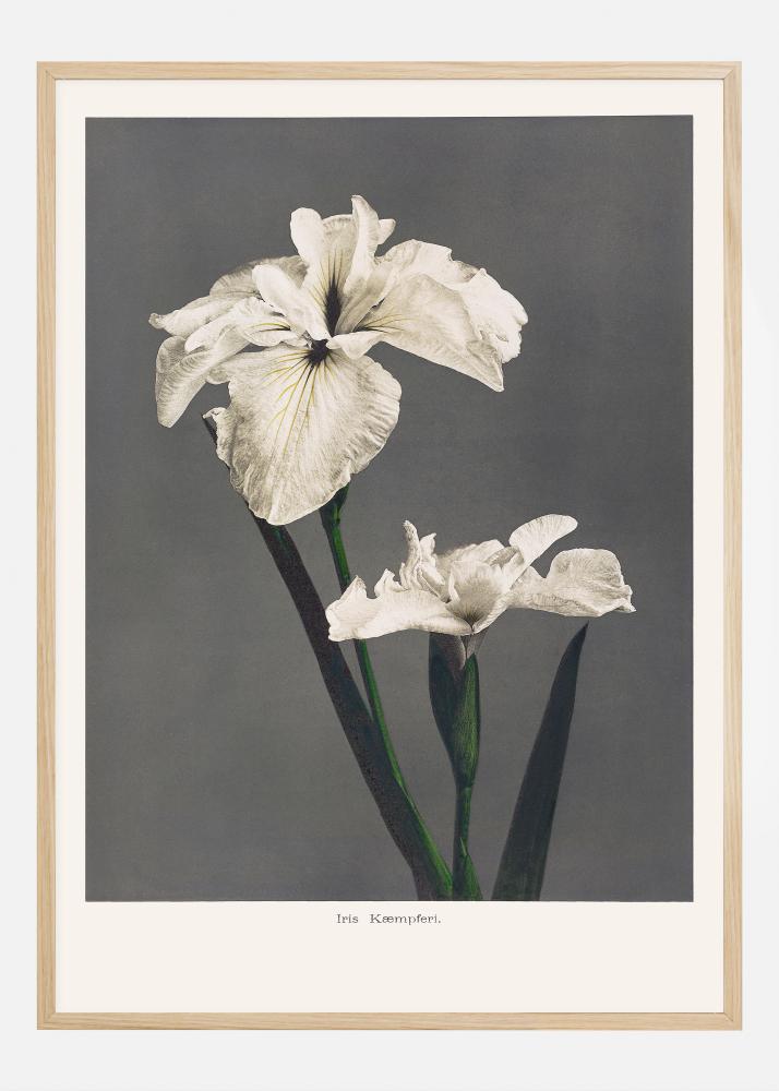 See elegantne plakat tutvustab Iris Kaempferi't, tuntud ka kui Jaapani iiris, kahvatukuldsete ja valgete toonidega peene halli tausta vastu, mis tõstab esile nende lummavate lillede skulpturaalsed omadused. Lillede struktuuri detaile on hästi rõhutatud varjude ja valguse mänguga kroonlehtedel, samal ajal kui tumedad, peaaegu mustad triibud lille südames lisavad sügavust ja dimensiooni. Harmooniline värvi ja kuju kombinatsioon, mis taasloob nende lillede loomuliku ilu.
