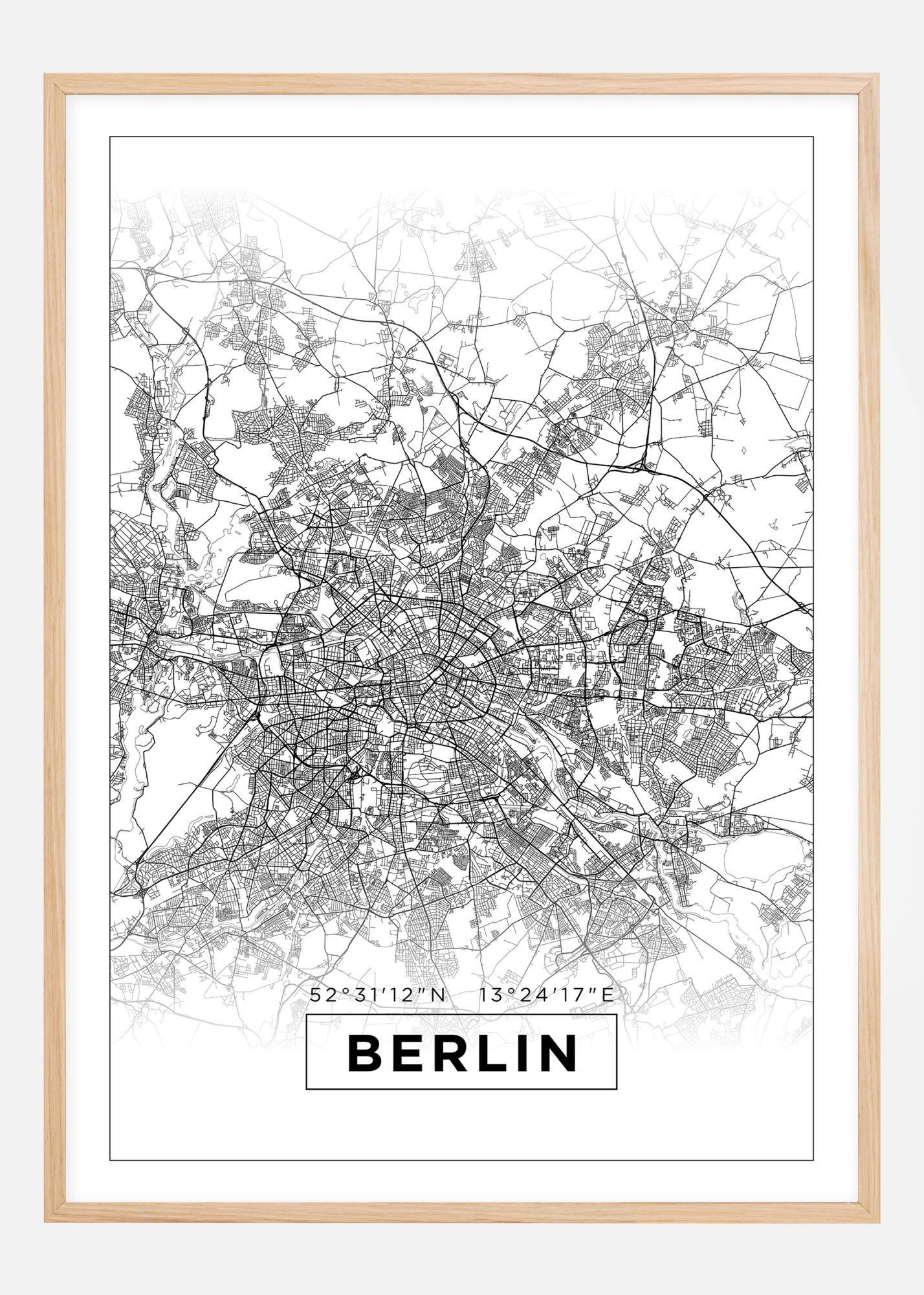 Siin näeme, kuidas Saksamaa süda laotub nagu lill must-valgel taustal. Püstformaadis kaardiplakat, mis näitab Berliini kogu teedevõrku, raamides linna kõik tänavad ja väljakud. Ülal- ja allosas kaardil tuhmuvad kõik mustad linid valgeks ja on ümbritsetud õhukese musta raamiga. Kaardipildi allosas on suurelt trükitud Berliin ja selle kohal on linna koordinaadid; Berliin on raamistatud nagu kaardipilt ise. Motüüri ümbritseb natuke laiem valge ääremuster, mis elegantselt tõmbab pilgu selle sisule. Ilus ja stiilne kaardiplakat, mis kaunistab kergesti iga seina!