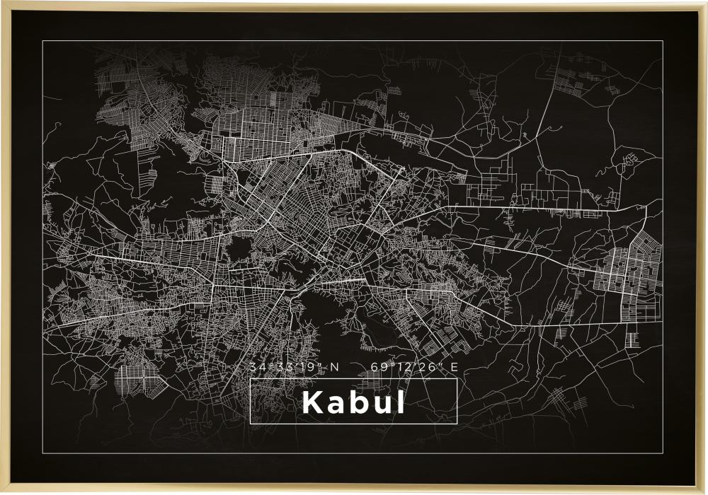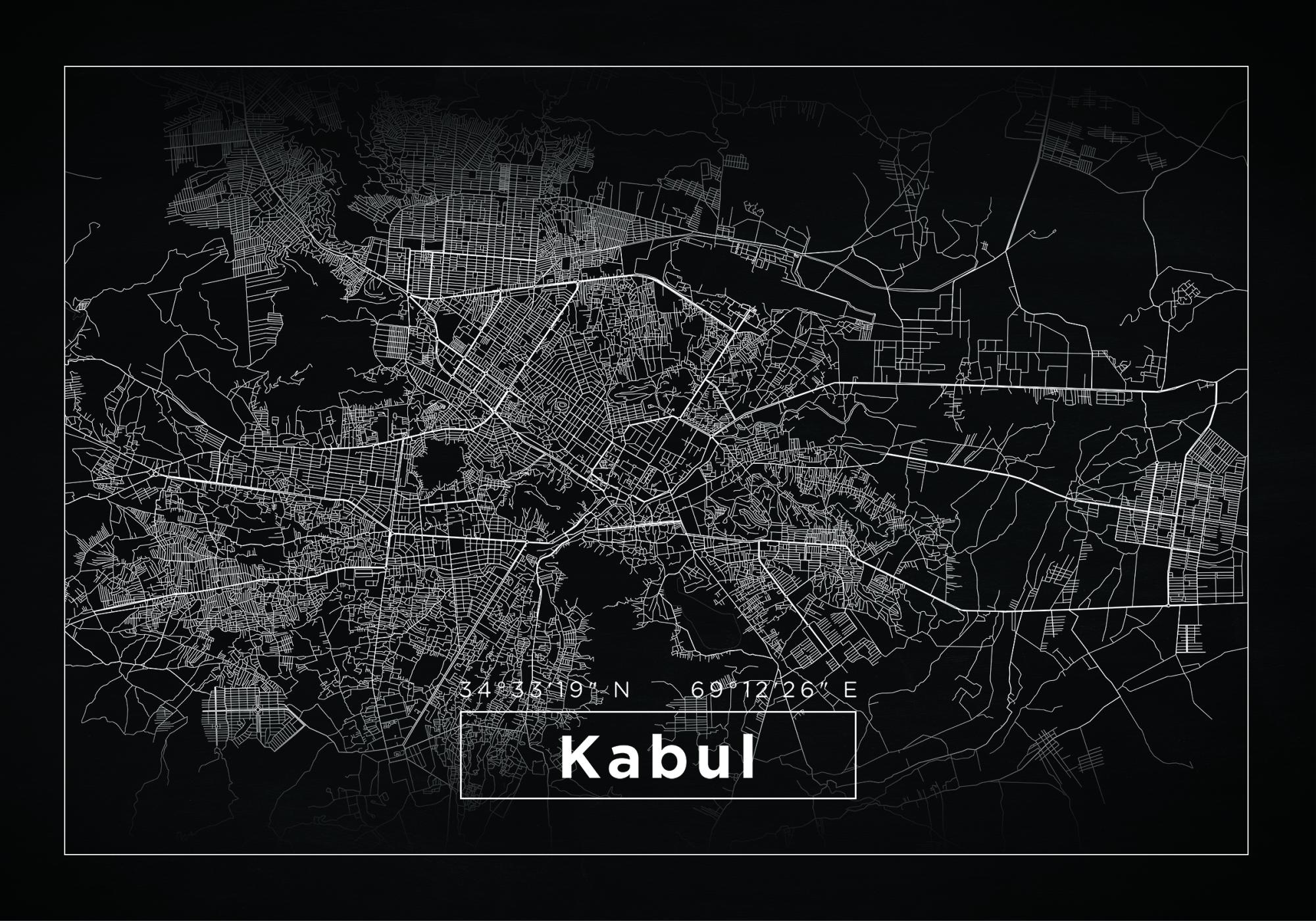 Selle linna kaardil laotub Kabul välja horisontaalses formaadis valgel mustal taustal. Negatiivi meenutava väljendusega on linna tänavad ja väljakud nikerdatud suures minimalistlikus ruudustikus, mis pildi üla- ja alaosas hajub ning on ümbritsetud õhukese valge raamiga. Pildi allosas on Kabul trükitud ja raamitud samamoodi nagu kogu kaardil ning selle kohal on linna koordinaadid. Hämmastavalt maitsekas kaartposter, mis loob teie seinale selle väikese lisapilgu!