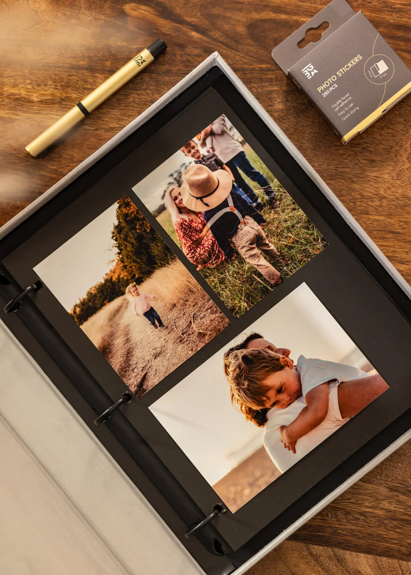 Album on kujundatud tekstiiliga kaetud karbina, mida saab lihtsalt avada, et albumis vaadata, ning sellel on stiilne hall toon. Albumi avamisel kohtud kauni ja diskreetse trükisega kesta sees ja rõngasköites 30 musta lehega (60 lehekülge), millesse saad oma ilusaid fotomälestusi lisada. Fotode kleepimine on enda teha, mis annab ruumi nii paindlikkuseks kui ka loovuseks.