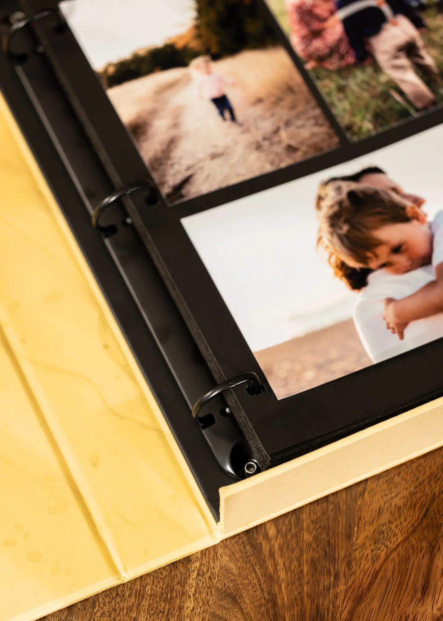 Album on loodud tekstiiliga kaetud karbina, mida saate hõlpsalt avada, et selles lehti sirvida, ning sellel on ilus kollane toon. Kui avate albumi, kohtate kaunist ja peent trükki kaane siseküljel ning rõngasklambrit 30 musta lehega (60 lehekülge), mida saate täita oma kaunite fotomälestustega. Saate ise pildid kleepida, mis annab teile paindlikkuse ja loomingulisuse ruumi.