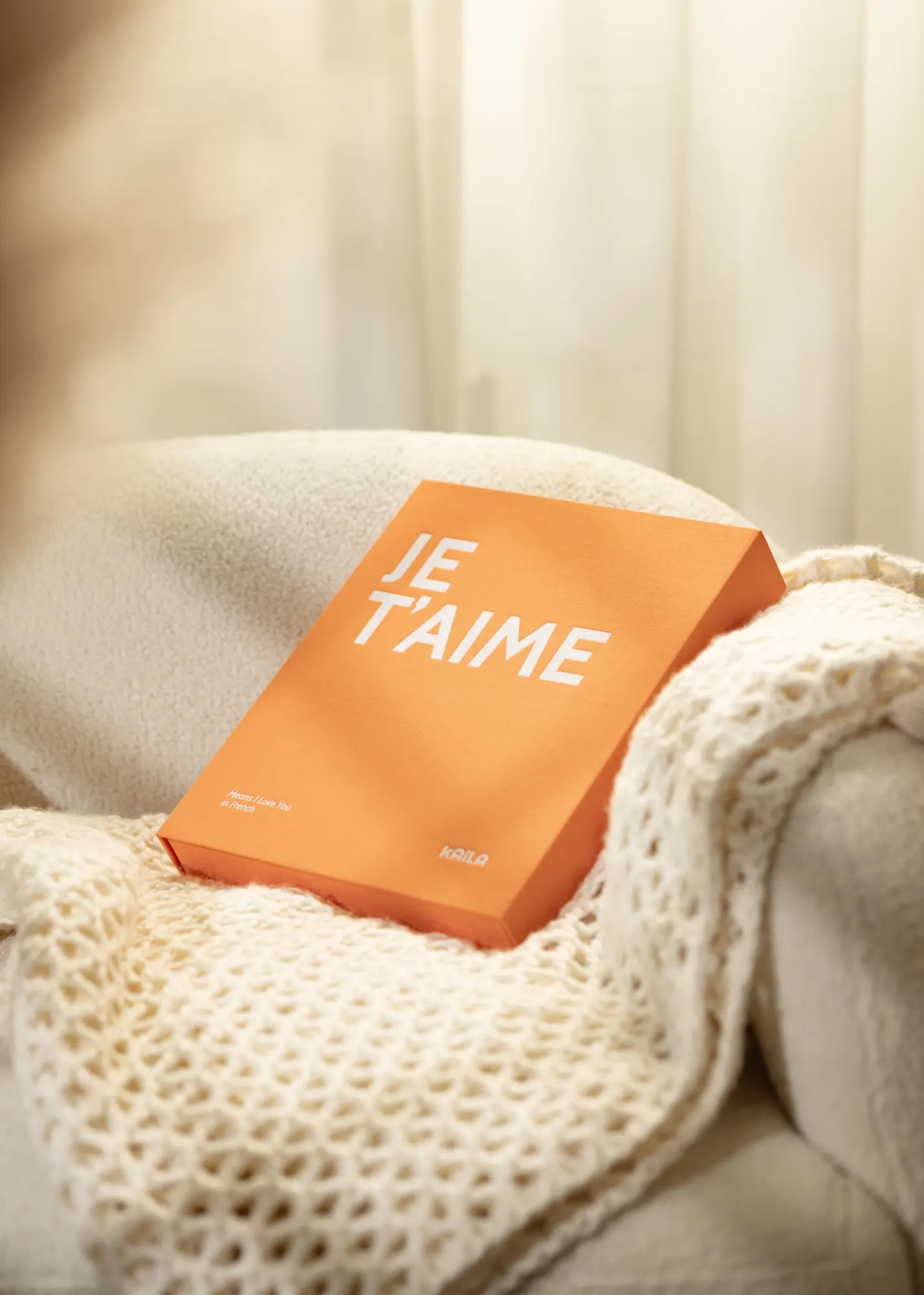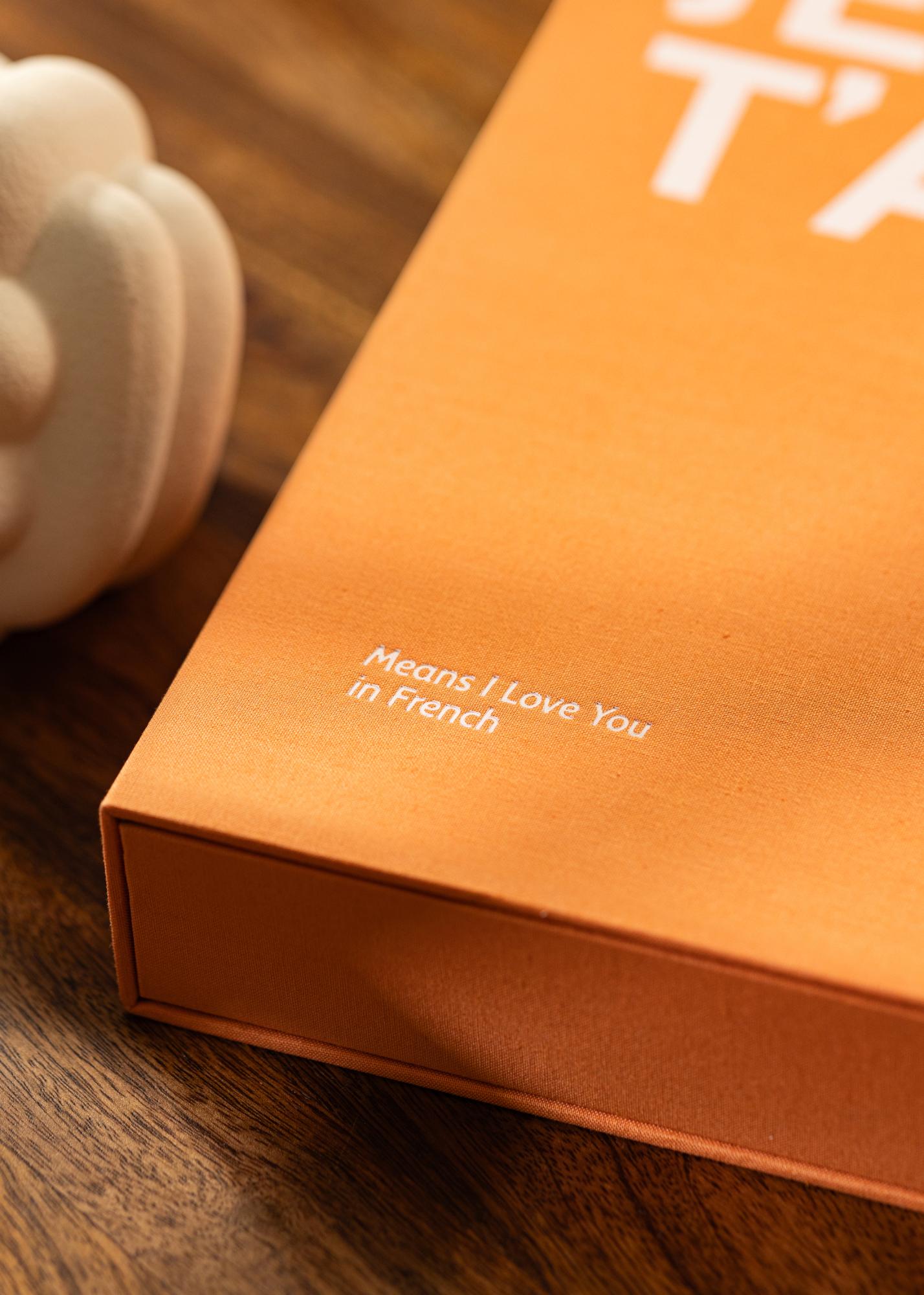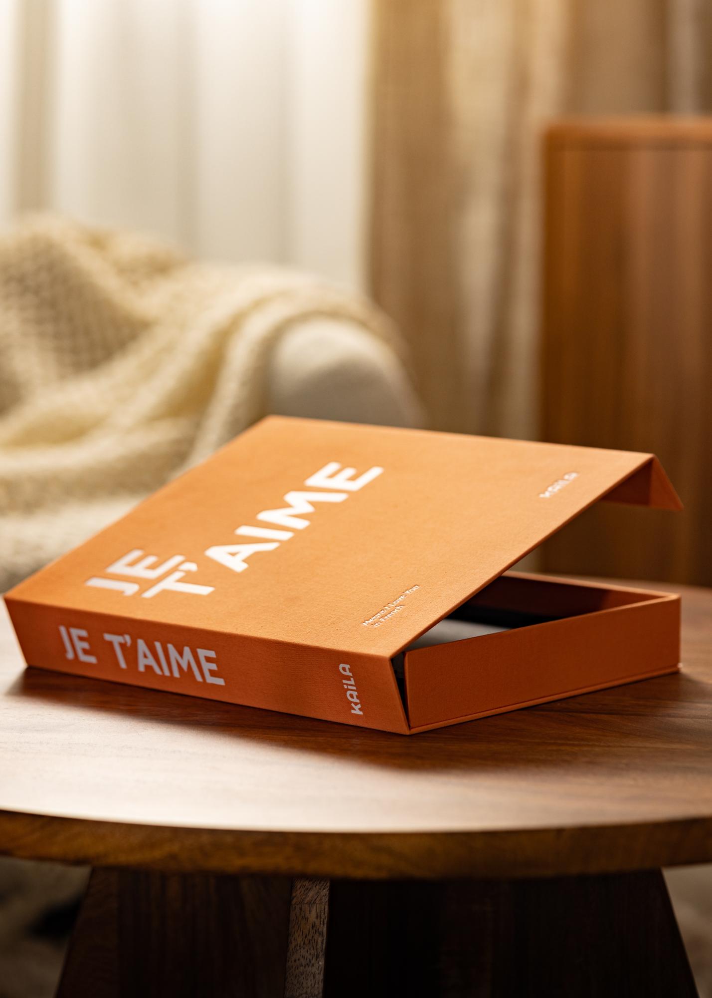 See kohvilaua album pakub stiili, luksust ja romantikat. Selle eksklusiivne disain on kujundatud kui karp tekstiiliga kaetud kaanega stiilses oranžis värvitoonis. Kaanel on kaunistatud valge tekst fraasiga "JE T'AIME", millele järgneb kirjeldav alapealkiri "Means I Love You in French". Sees on kaunilt kaunistatud sisekaas ning 60 musta albumi lehte (30 lehekülge). Kuna kleebid oma pildid ise albumisse, on sul võimalus olla loominguline.