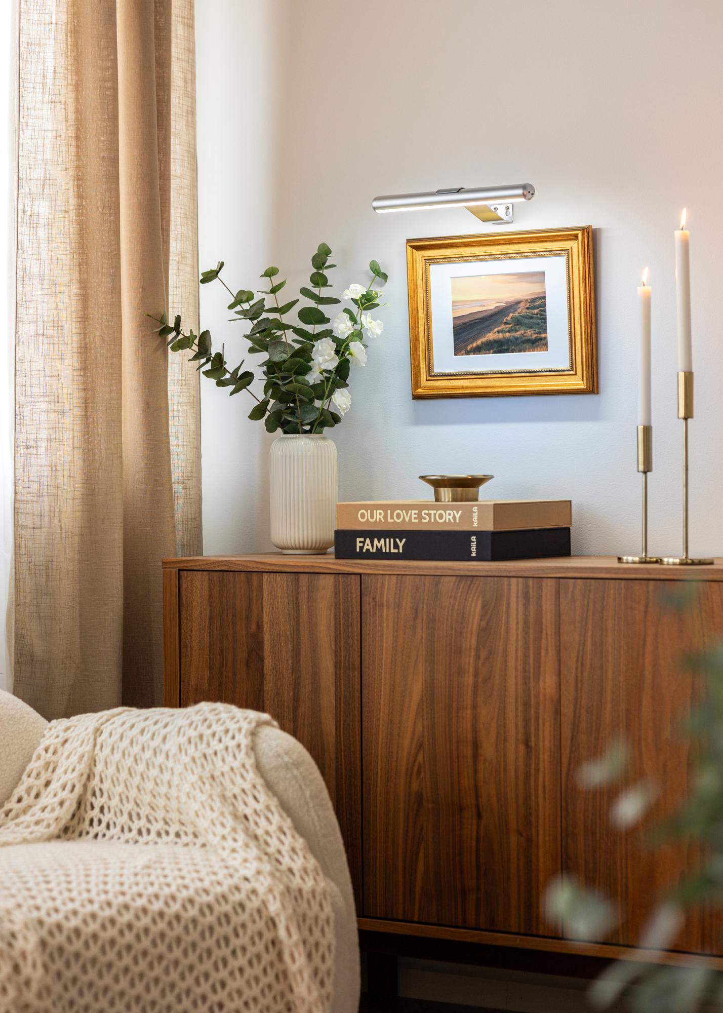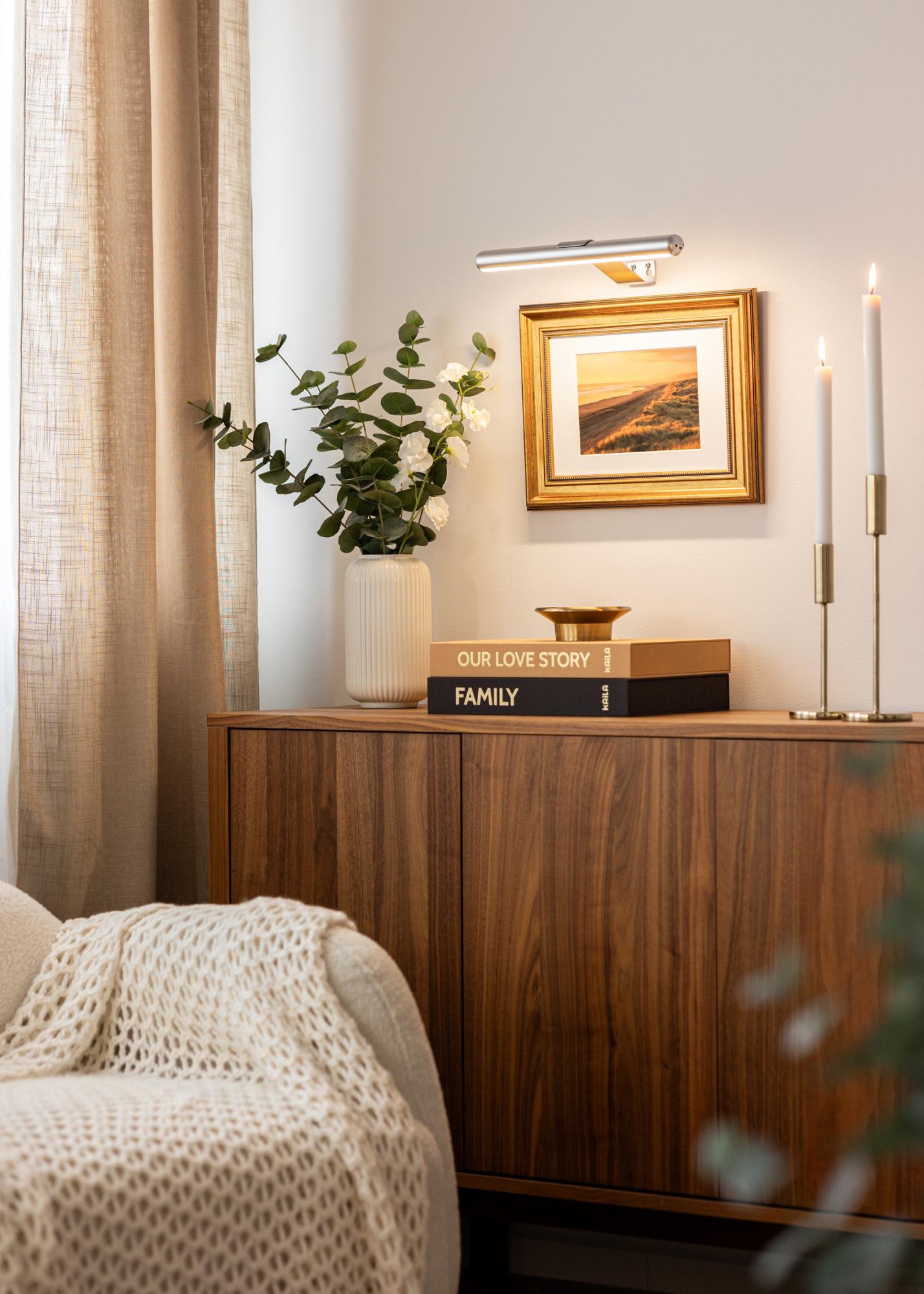 See hõbedane patareitoitel pildivalgusti on praktiline ja esteetiliselt meeldiv lahendus oma kunstiteoste valgustamiseks ilma juhtmete tülikuseta. Tänu patareitoitele saate selle paigutada kuhu iganes, sõltumata elektripistikust. Sügavusega 15 cm ja pikkusega 33 cm on see nii diskreetne kui ka efektiivne, et esile tuua kuni 60 cm maksimaalse laiusega kunstiteoseid.