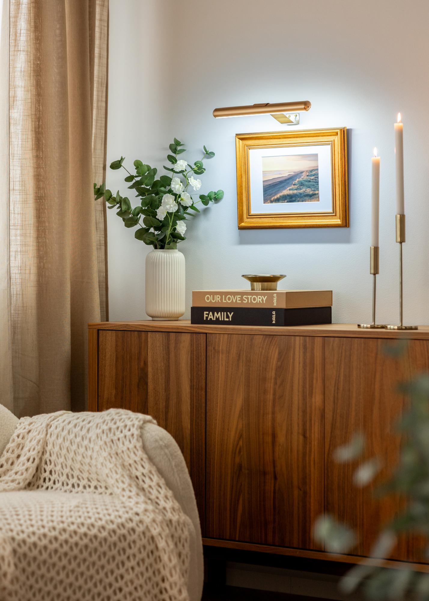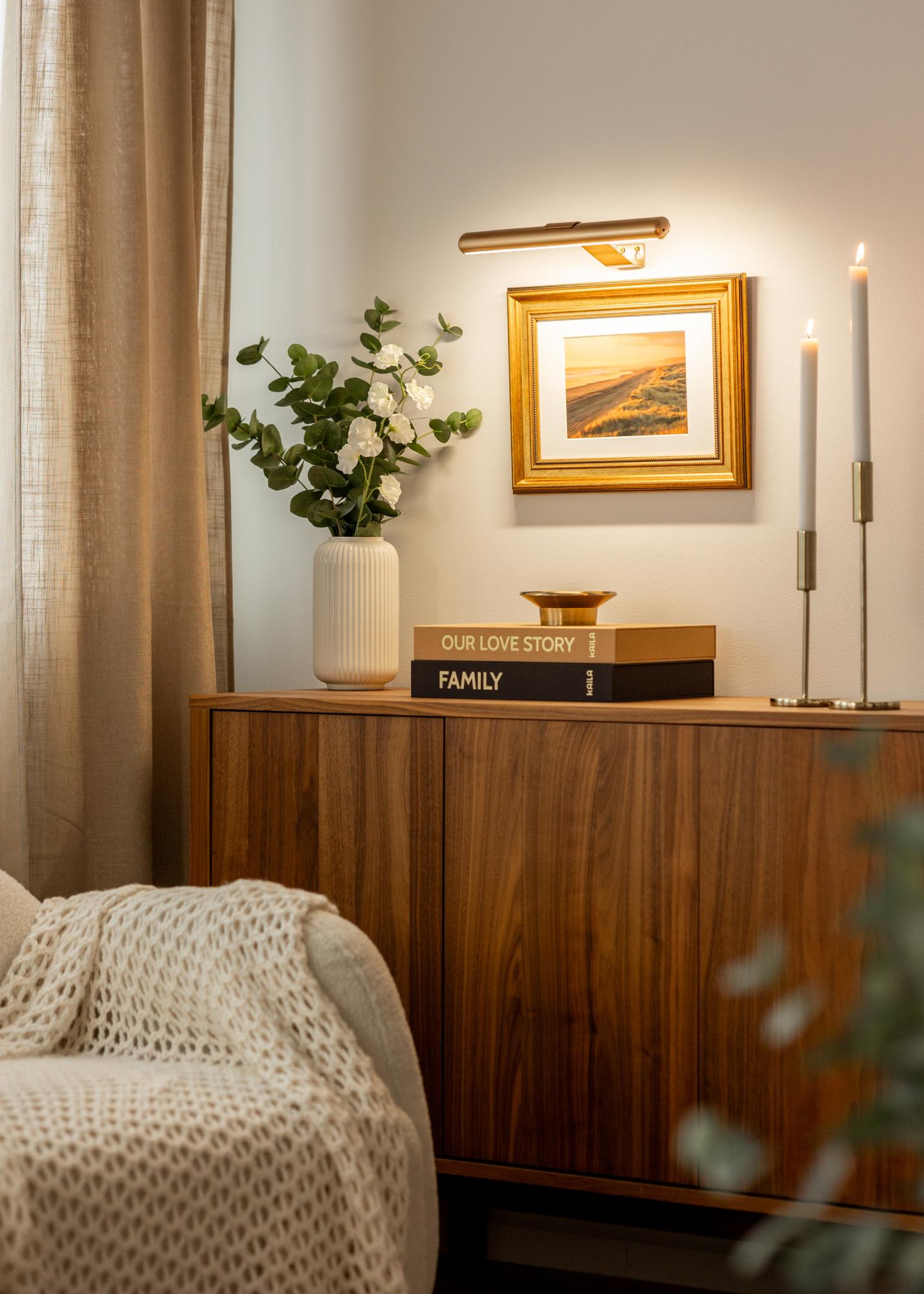 See elegantne kuldses toonis patareitoitega pildivalgustus pakub stiilset ja paindlikku lahendust oma kunstiteoste valgustamiseks ilma nähtavate juhtmeteta. Patareitoitega pildivalgustite ainulaadsus seisneb selles, et saate selle hõlpsasti paigutada täpselt sinna, kuhu vaja, ilma et peaksite muretsema pistikupesa läheduse pärast. 33 cm pikkuse ja 15 cm sügavusega sobib see ideaalselt kuni 60 cm laiuste kunstiteoste valgustamiseks.