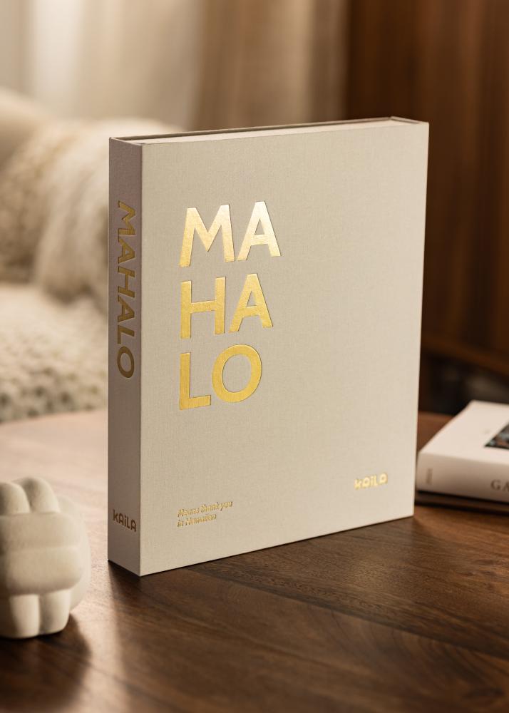 Selle kohvilaua raamatu abil saad praktilise fotoalbumi ja ilusa sisekujunduselemendi ühes ja samas pakendis! Album on kujundatud eksklusiivse karbina, millel on hallist kangast kaaned ja kuldne tekst, mis ütleb "MAHALO". Albumi vasakus nurgas on alapealkiri "Tänab havai keeles". Klassikaline väljend teeb sellest kohvilaua albumist ideaalse lisandi raamaturiiulisse või elutoa lauale.