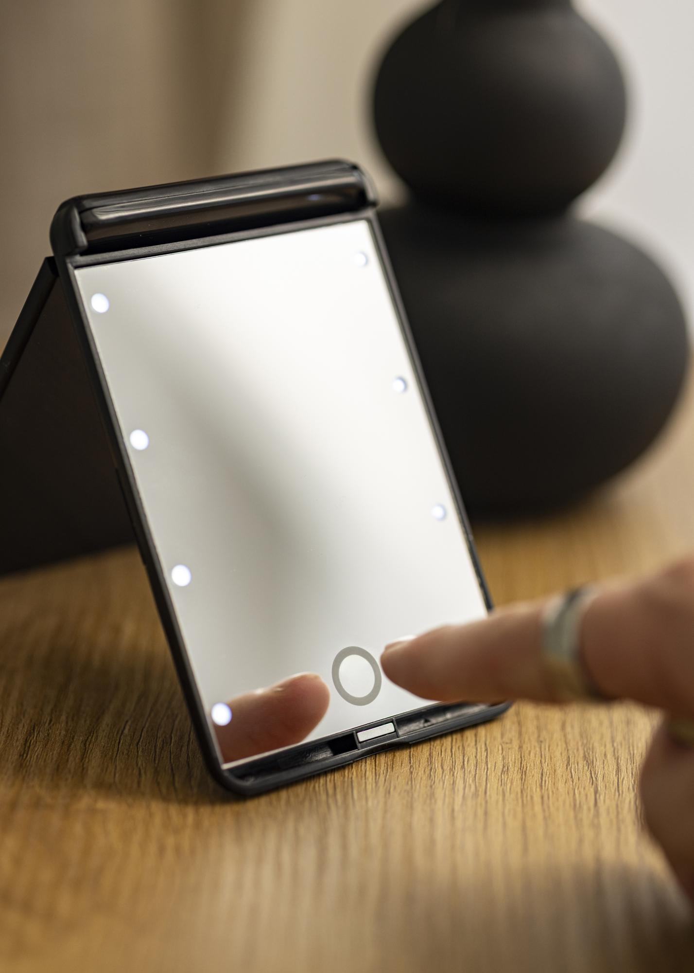See on kokkupandav meigipeegel stiilses mustas disainis, mis võimaldab teil end hõlpsasti peegeldada, kus iganes te asute. Meigipeeglil on integreeritud valgustus ümber kristallselge peegliklaasi kujul 8 tugevat LED-tuld. Ülemisel peeglil on suurendav peegliklaas x2 suumiga. LED-valgustus on hämar ja annab hubase sooja valge sära temperatuuriga 3000K, mida saab lihtsalt reguleerida, hoides all ekraani puutenupul.