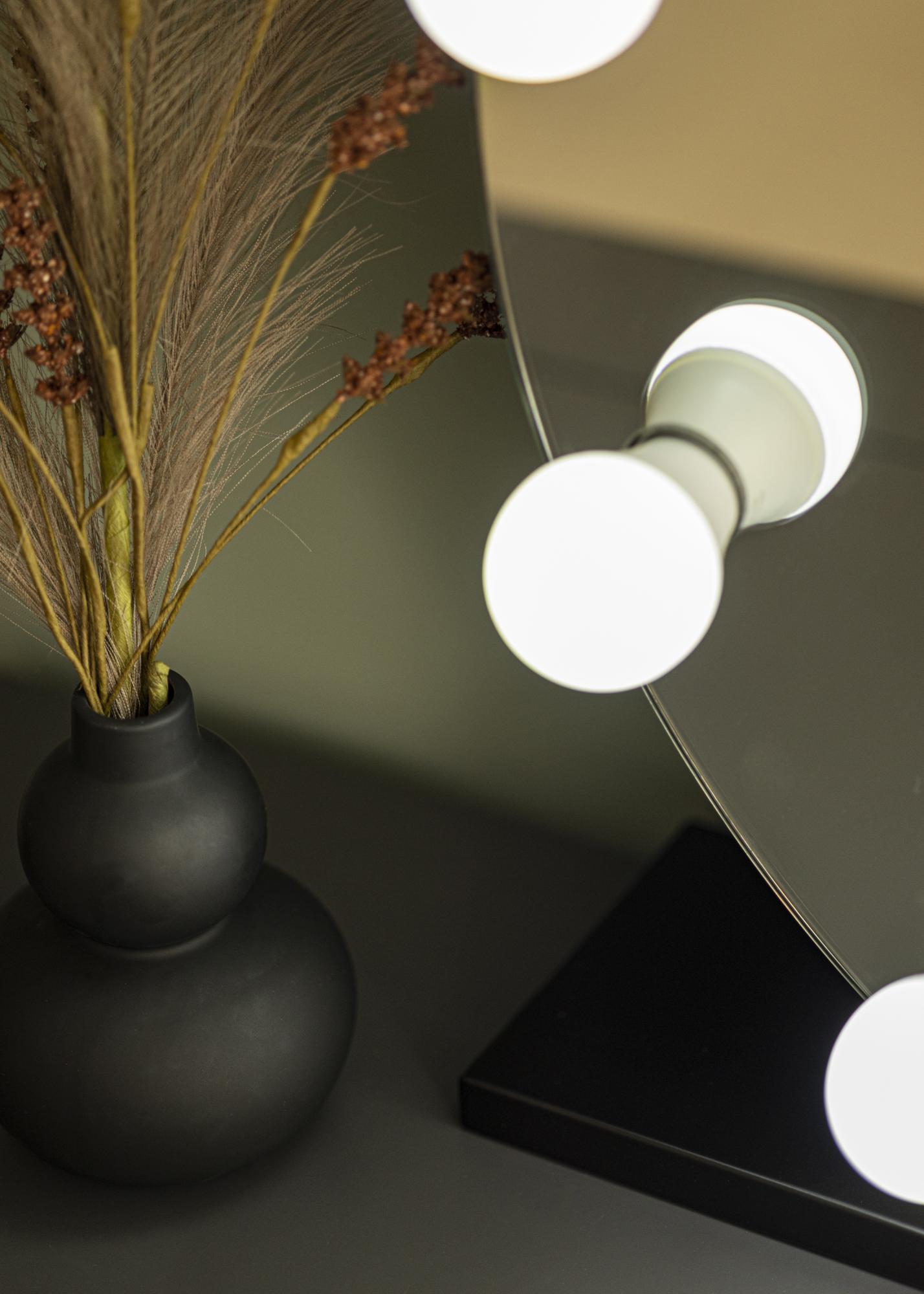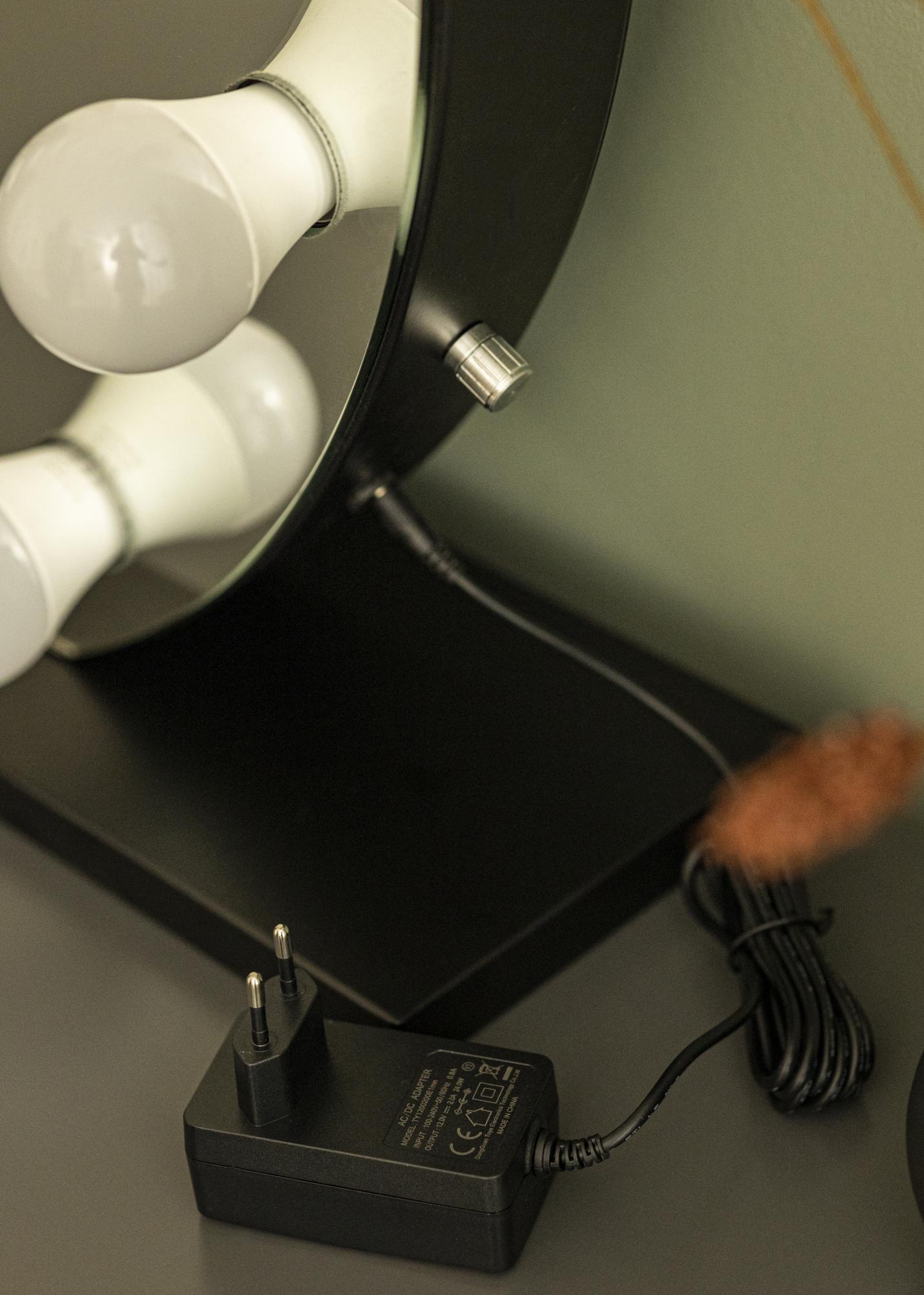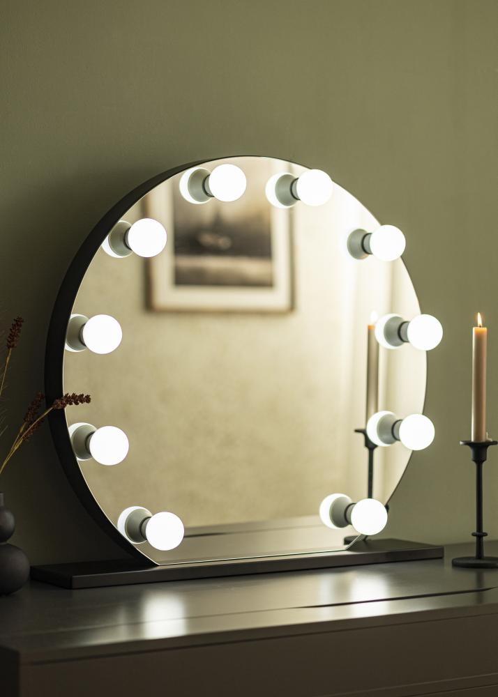 See dekoratiivne peegel annab sulle stiili ja funktsionaalsuse ühes paketis! Sellel on stiilne disain, ümmargune kuju, elegantne must jalg ja 10 E27 sokliga pirni, mis kaunilt raamivad peegelpinda. Integreeritud valgustuse külma valge valgus on ideaalne päeva ettevalmistusteks. Peeglile on võimalik leida püsti asend, mistõttu saad selle lihtsalt paigutada magamistuppa, elutuppa või koridori, kus meigipeegli valgustus võib töötada ka kauni taustavalgustusena. Peegel on võimalik paigaldada ka seinale. Valgustus on hämar ja selle reguleerimiseks pööra nuppu, mis asub peegli serval.