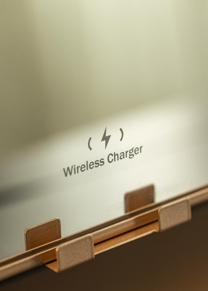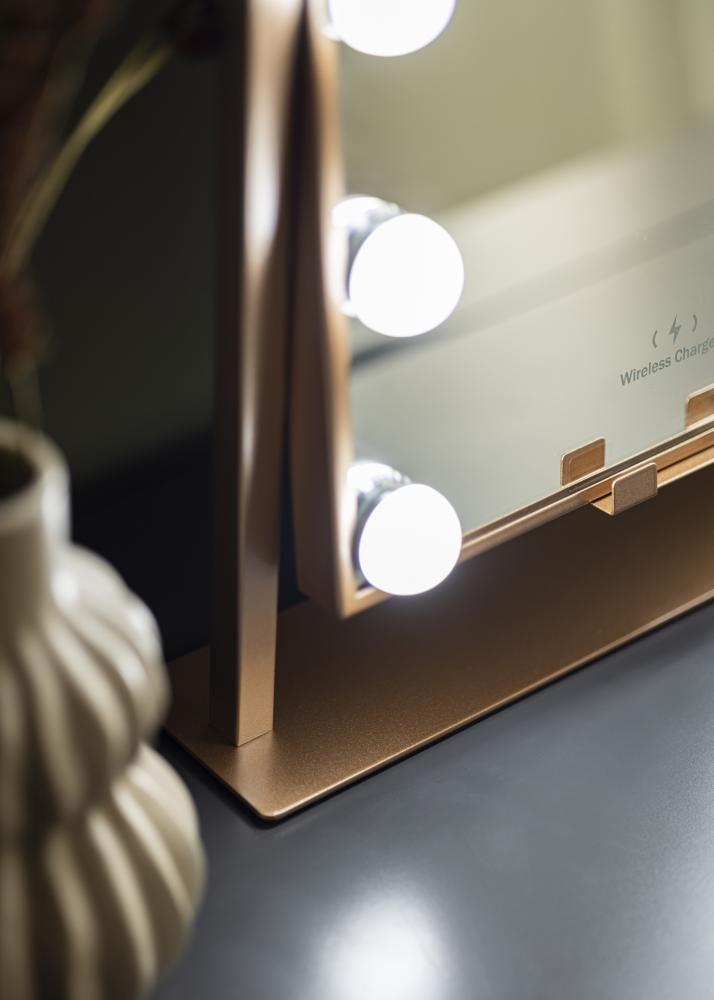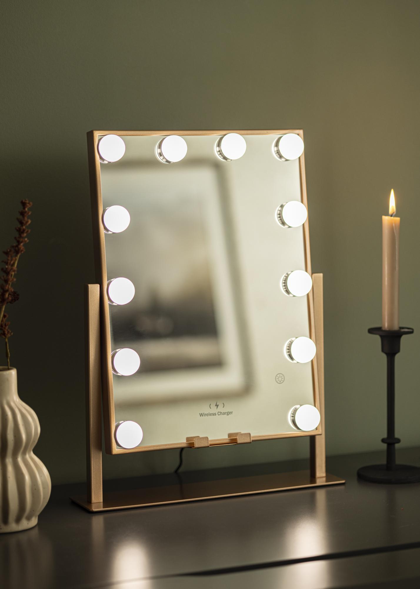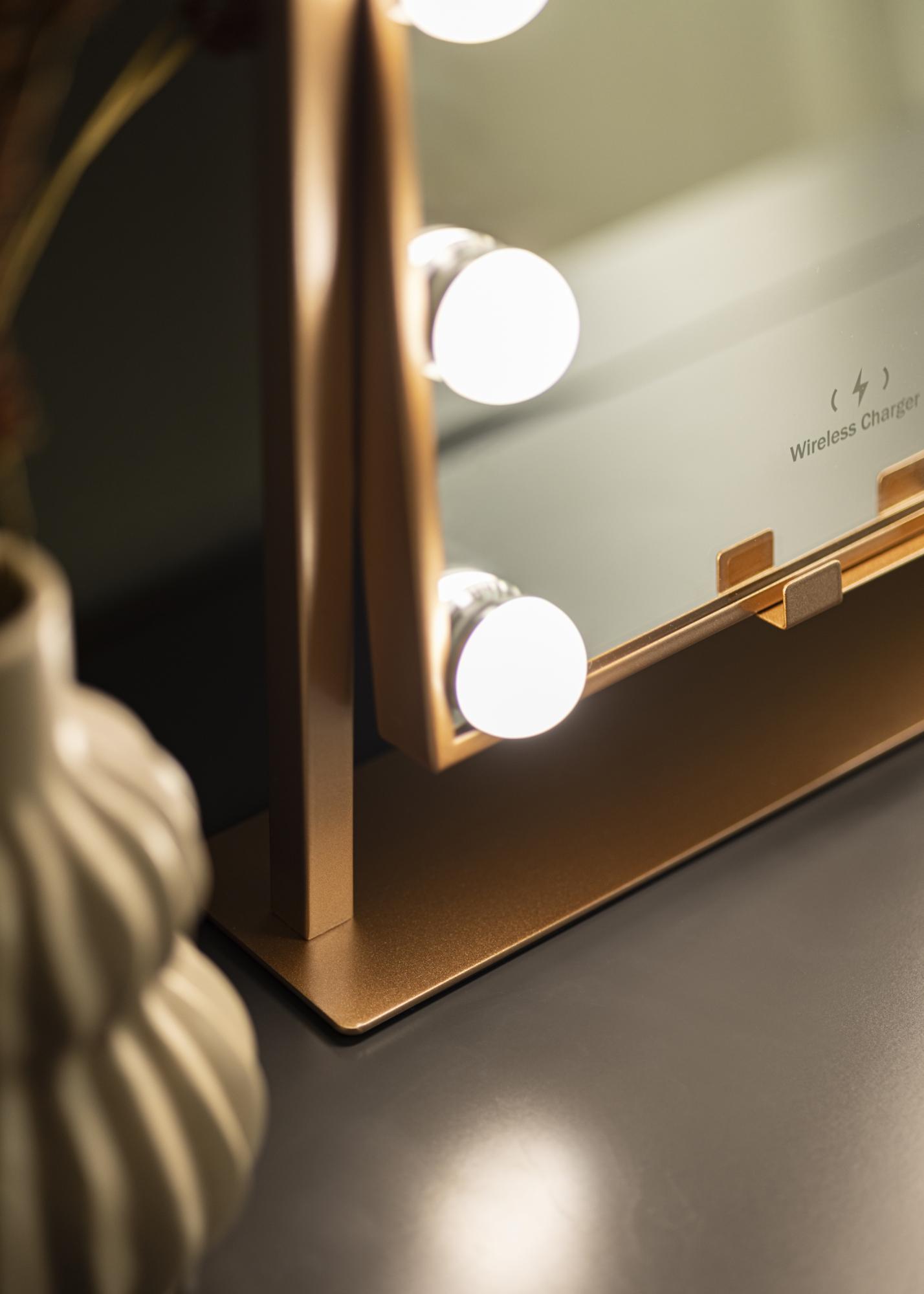 See on roosakuldse tooniga meikimispeegel, mille luksuslikuks funktsiooniks on juhtmevaba laadimine! Kui peegel on sisse lülitatud, asetage oma telefon ettenähtud kohale, et seda laadida võimsusega 5V/2A (10W). Laadimisfunktsioon töötab kõigi nutitelefonide seadmetega, mis toetavad juhtmevaba laadimist. Teised nutikad funktsioonid, mida see peegel pakub, on reguleeritav peegelpind ja sisseehitatud LED-valgustus, mis pakub head valgustust meigi pealekandmisel. Valgustus koosneb 12 LED-lambist, mis kaunilt raamistavad peegelpinda ja annavad kogu peeglile stiilse välimuse. Valgustus on hämardatav ning soovitud valgus tugevuse seadistamiseks hoidke ees asuvat puutenuppu paar sekundit all.
