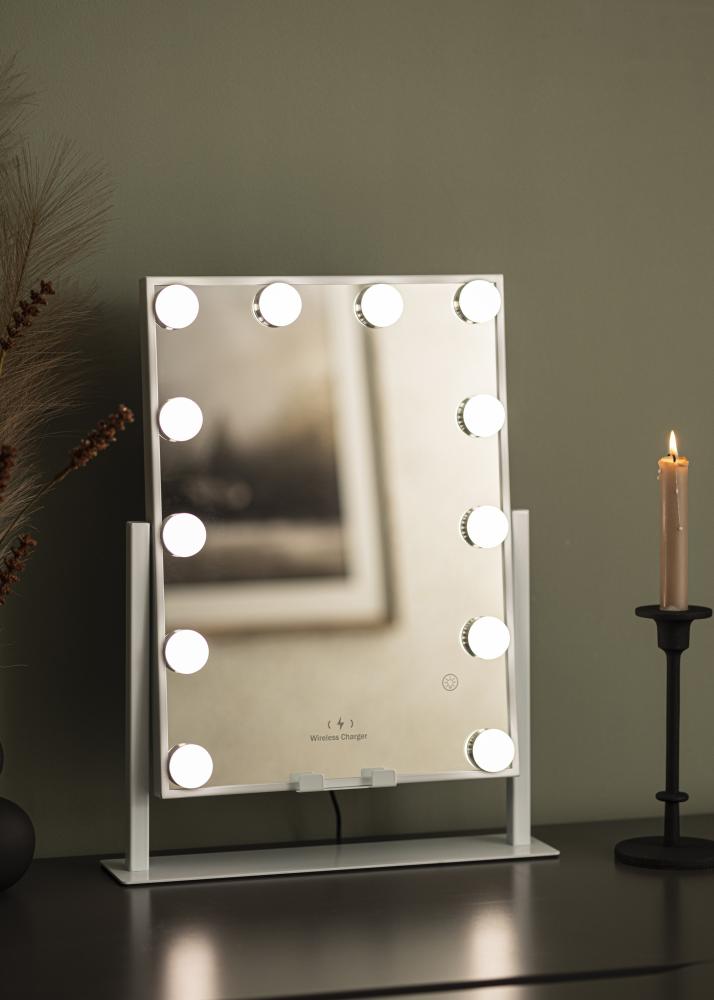 Püsti seisva disaini ja elegantse valge tooni kombinatsioon on väga stiilne ning nutikas konstruktsioon võimaldab peeglipinda kallutada. Peegel on varustatud LED-valgustusega, mis koosneb 12 lambist, ümbritsedes 30x41 cm suurust peeglipinda. LED-valgustus on hämardatav ning heleduse reguleerimiseks hoia mõni sekund peegli puutenupul. Toiteühendus toimub pistikuga.