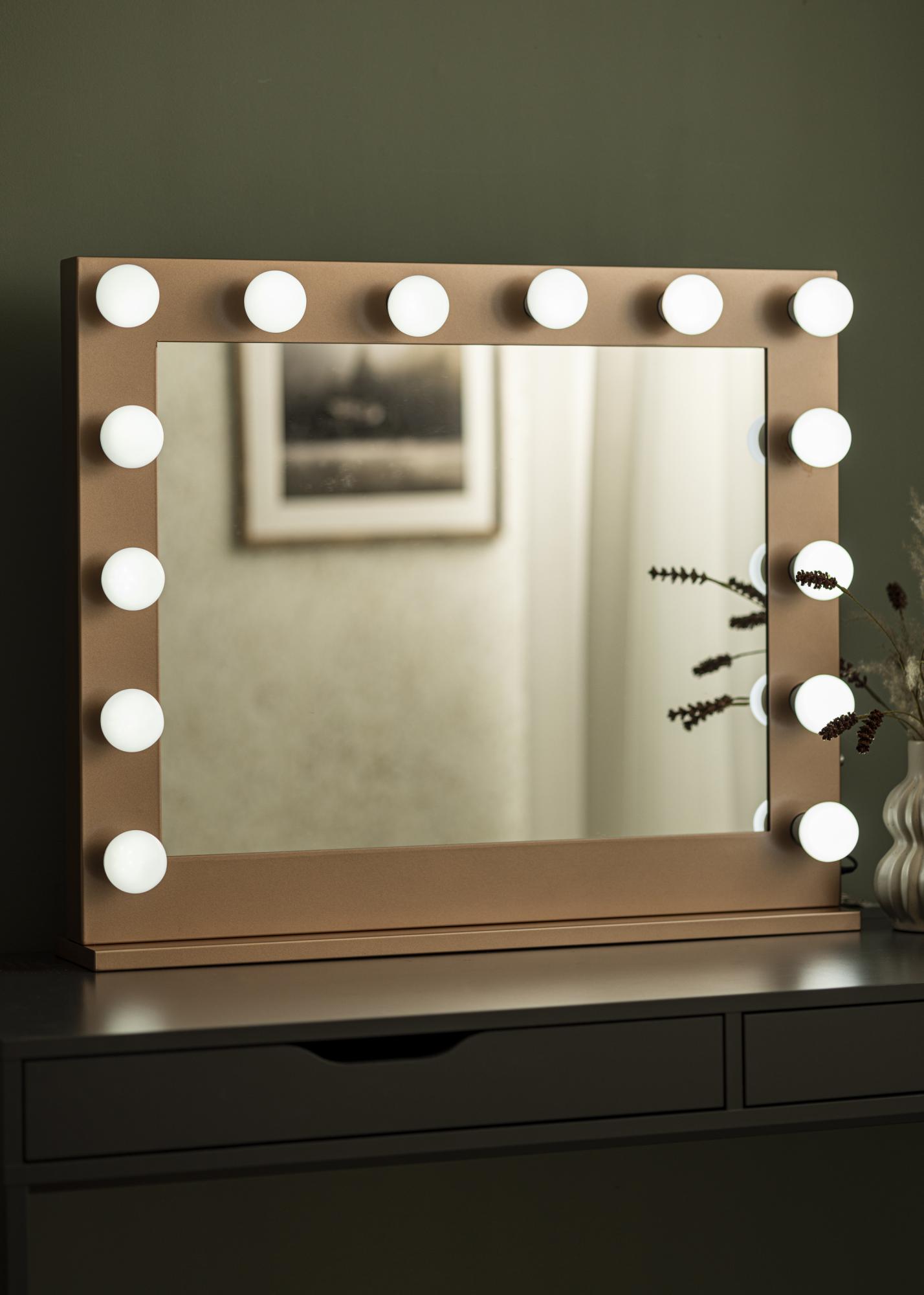 See on meigipeegel, mis on kõrge elegantsiga tänu Hollywoodi inspireeritud disainile laia raamiga roosakuldse tooniga, mis on kaunistatud 14 suure LED-pirniga. LED-pirnidel on E27 sokkel ja neid saab vajadusel lihtsalt vahetada. LED valgusallikana on peale selle nii säästev kui ka energiatõhus alternatiiv. Peegel kiirgab külma valget valgust, mida saab hämardada väikese pöördnupu abil peegli ühel küljel.