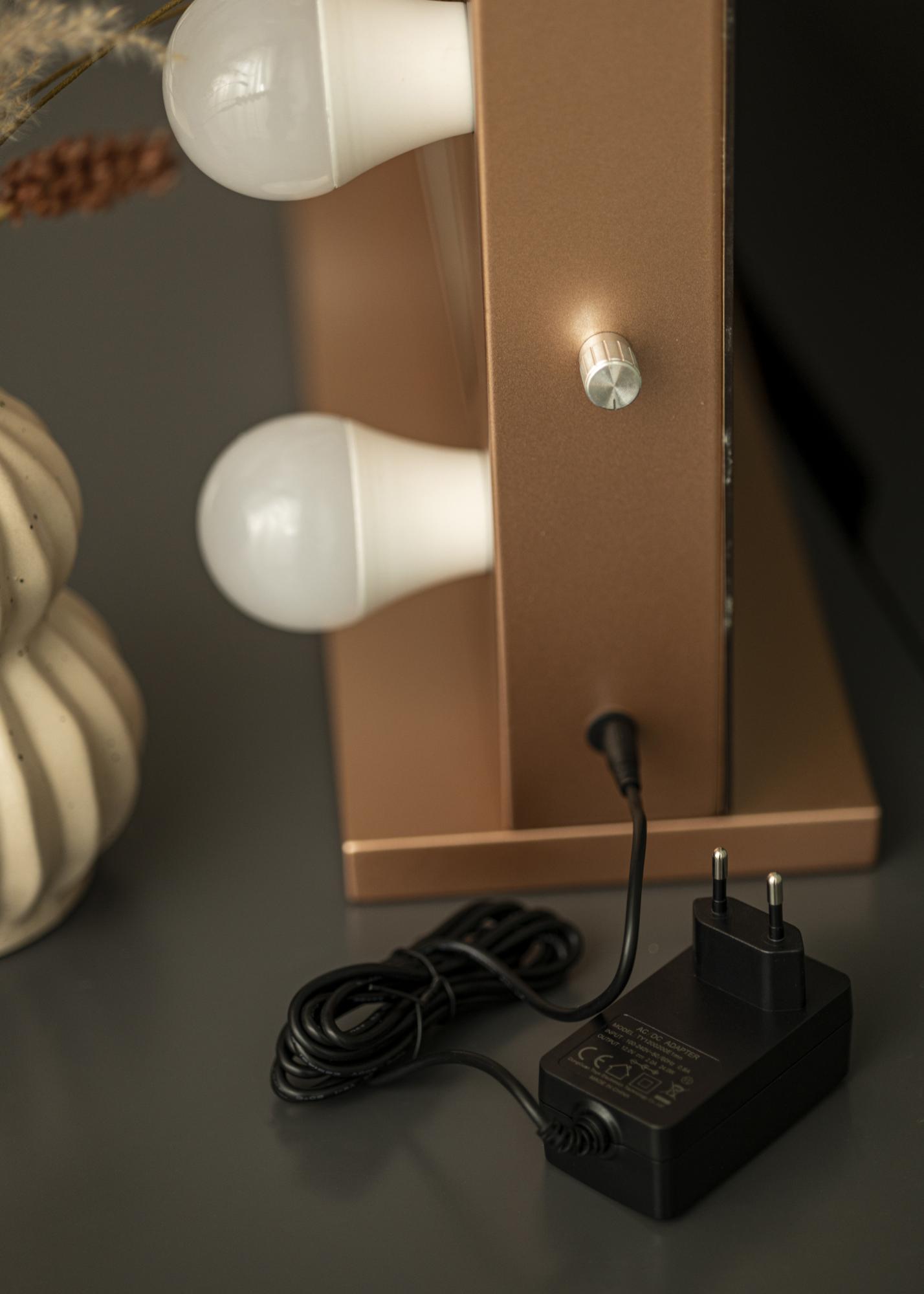 Roosakuldne raam sobib kokku sama stiilse varjundiga jalaga, mis muudab selle peegli täiuslikuks sisustuselemendiks nii laual kui ka kummutitel. Kui eelistate riputada peegli seinale, kasutades tagaküljel olevaid seinakinnitusi, saab hoidiku eemaldada. Elektriühendus toimub pistiku abil.