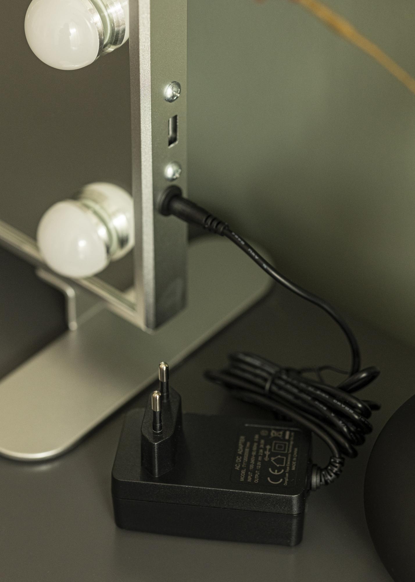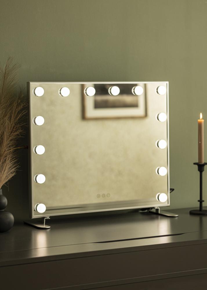 See on stiilne jumestuspeegel, mis saab olema kaunis sisustuselement kodu igas toas. Õhuke hõbedane raam, mis ümbritseb 60x50 cm suurt peegelpinda, annab väga stiilse ilme ja 14 ümarda LED-lambi, mis paiknevad peegli servades, pakuvad eksklusiivset tunnet. Peegli ühel küljel on USB-port, mis võimaldab laadida nutiseadmeid USB-ühenduse kaudu.