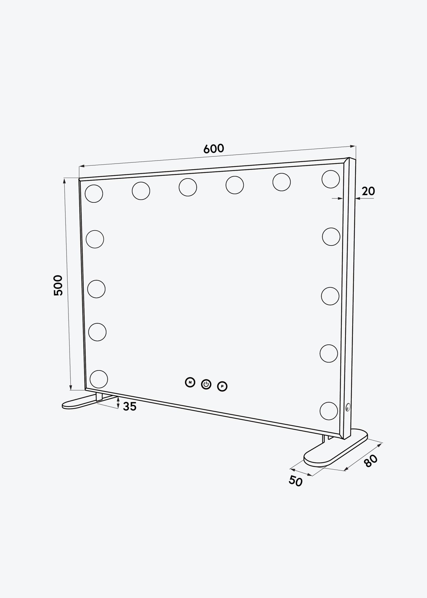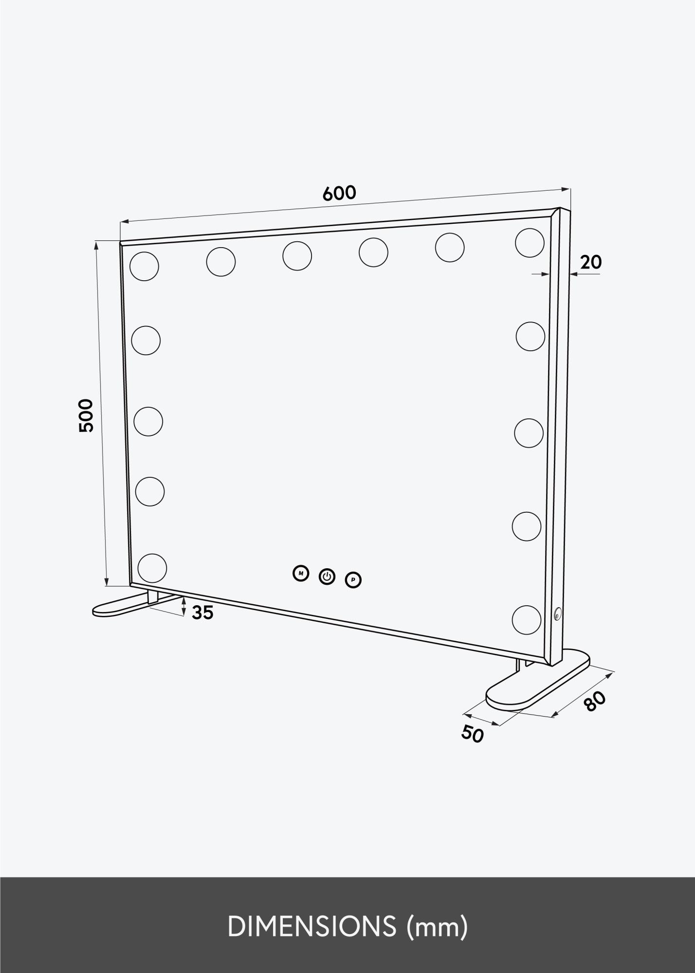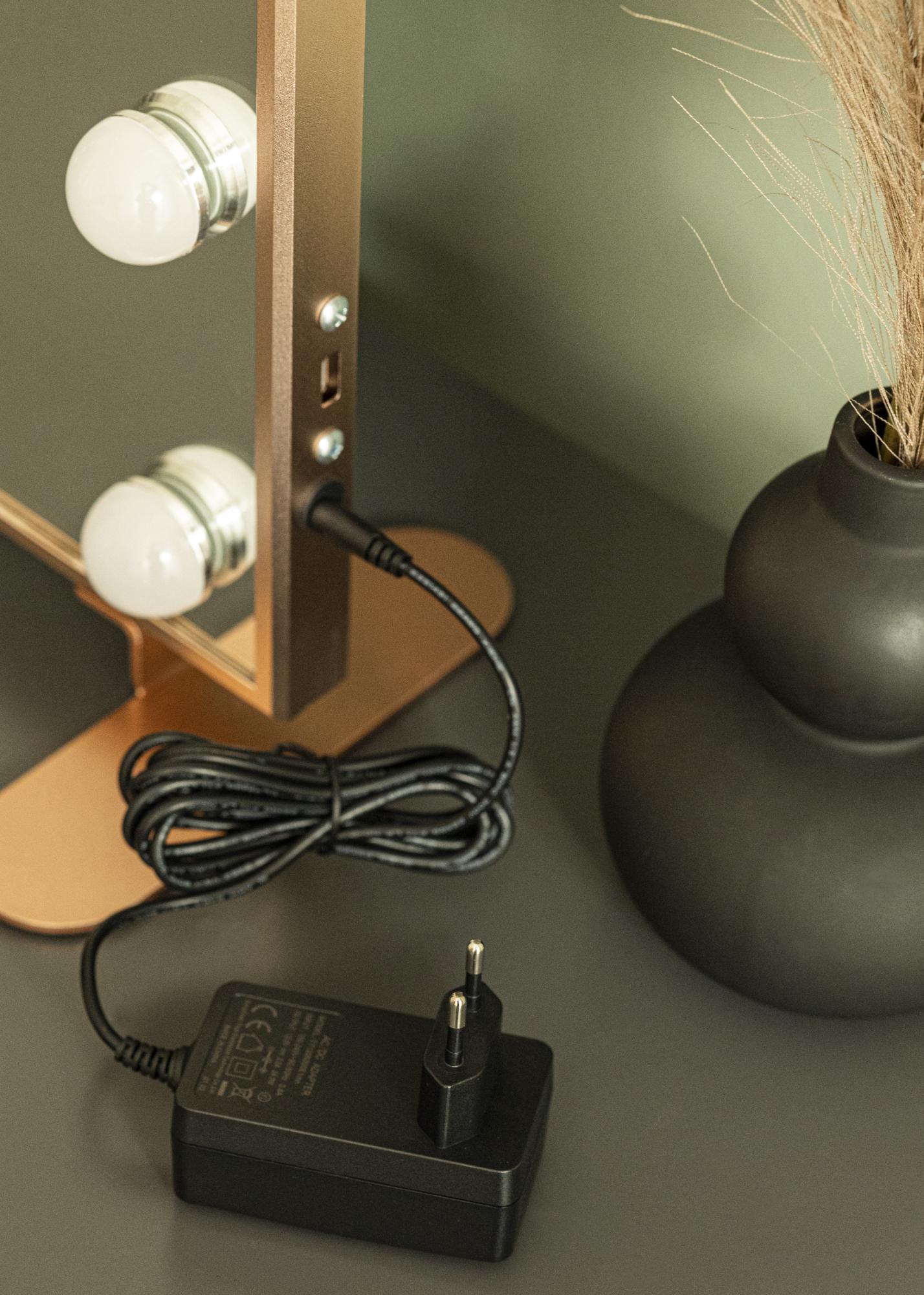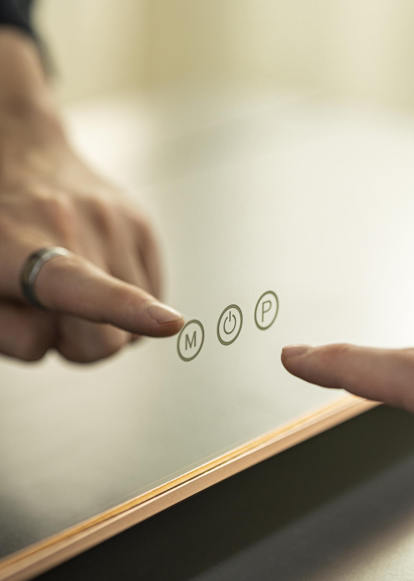 LED-valgustus on reguleeritav ja valgusseadeid saab muuta peegli allservas asuvate puute-nuppudega. "M"-nupp muudab värvitemperatuuri ja "P"-nupp reguleerib heledust. Samuti on olemas nupp, mis lülitab valgustuse sisse ja välja. Paindlik valgustus teeb selle peegli sobivaks nii elutuppa, kui soovite pehmemat valguskeskkonda, kui ka meiginurka, kui vajate eredamat valgust, mis aitab teil keskenduda. Peegel on lisaks varustatud USB-pordiga, nii et saate hõlpsasti oma nutiseadmeid laadida.