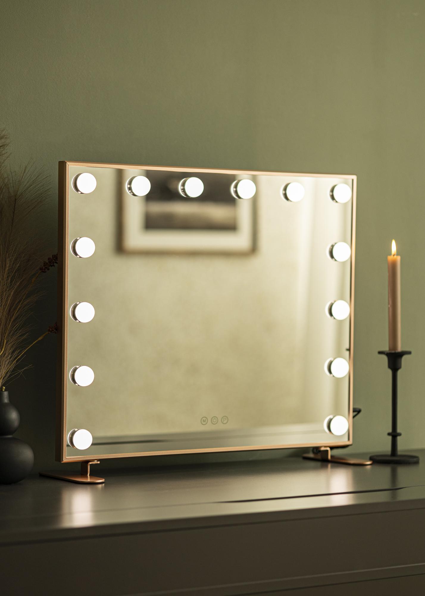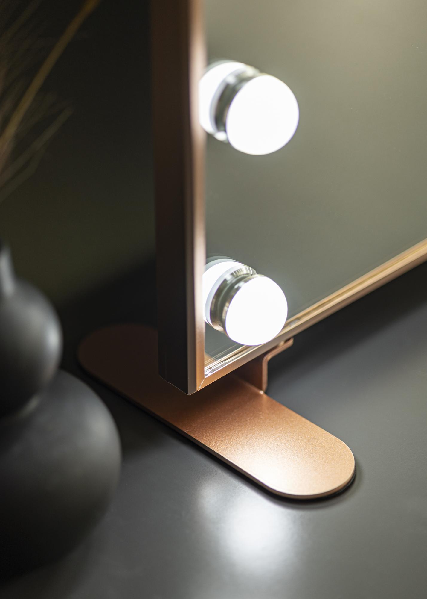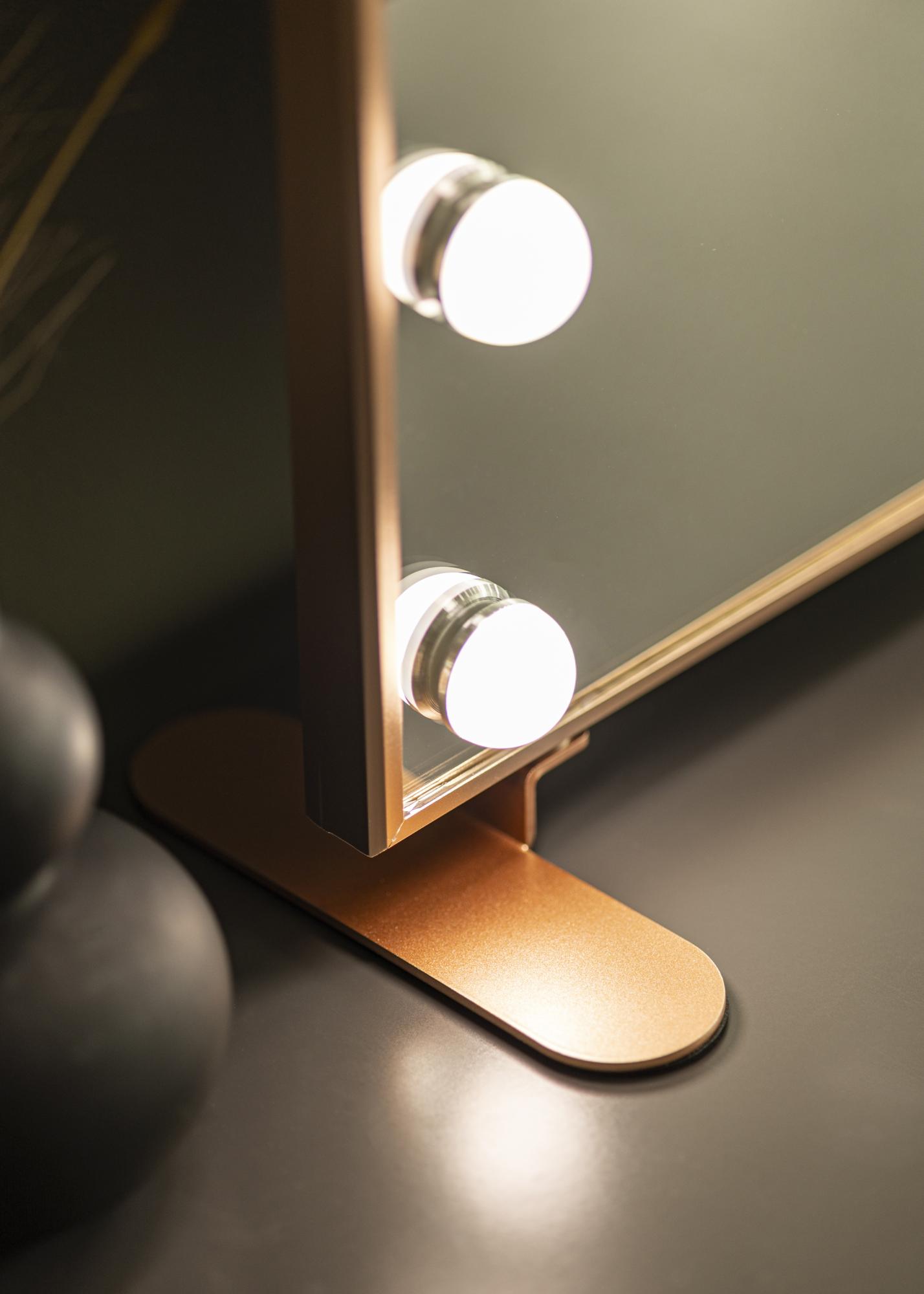 See luksuslik meigipeegel on õhukese roosa kulla toonis metallraamiga ja sellel on LED-valgustus 14 suure laternaga. See annab peeglile glamuurse Hollywoodist inspireeritud välimuse, mis lisab igasse tuppa stiili. Sellel on elegantne jalus, samuti roosa kulla toonis, mida saab eemaldada, kui soovite oma peegli seinale riputada.