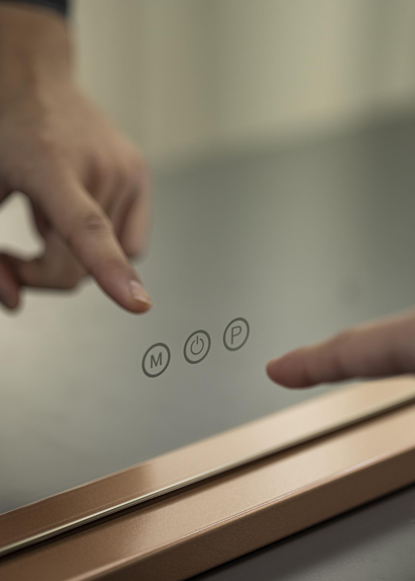 Meigi peegli peegelpinna mõõtmed on 58x46 cm ja peegelpinna alumisel serval on kolm puutetundlikku nuppu. Üks valgustuse sisse- ja väljalülitamiseks ning kaks valgustuse seadete muutmiseks. Hoides all "M"-nuppu, saate seadistada valguse värvitemperatuuri ja "P"-nupu abil saab valgustust lihtsalt reguleerida soovitud heleduse tasemele. Elektriühendus toimub pistiku kaudu.