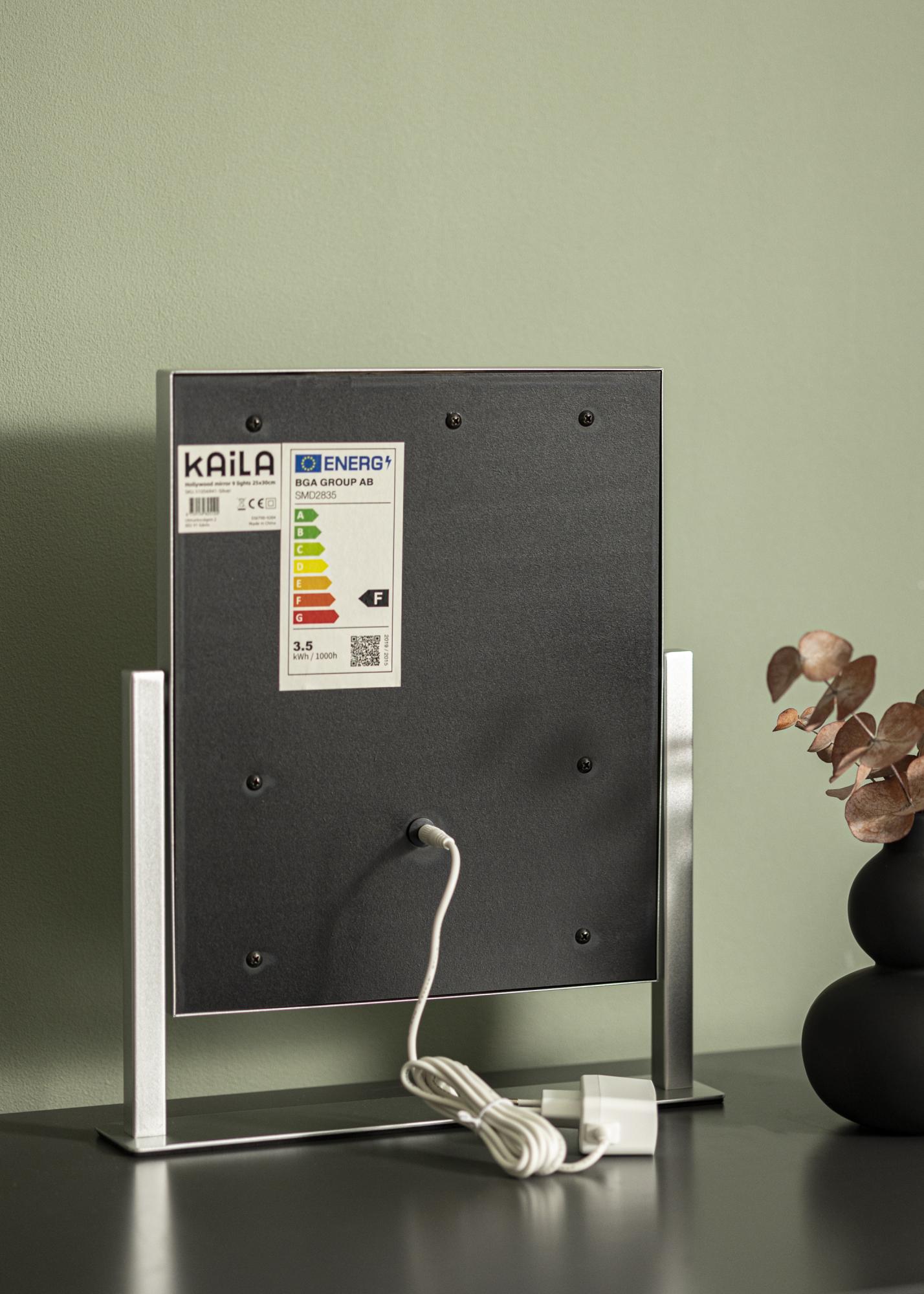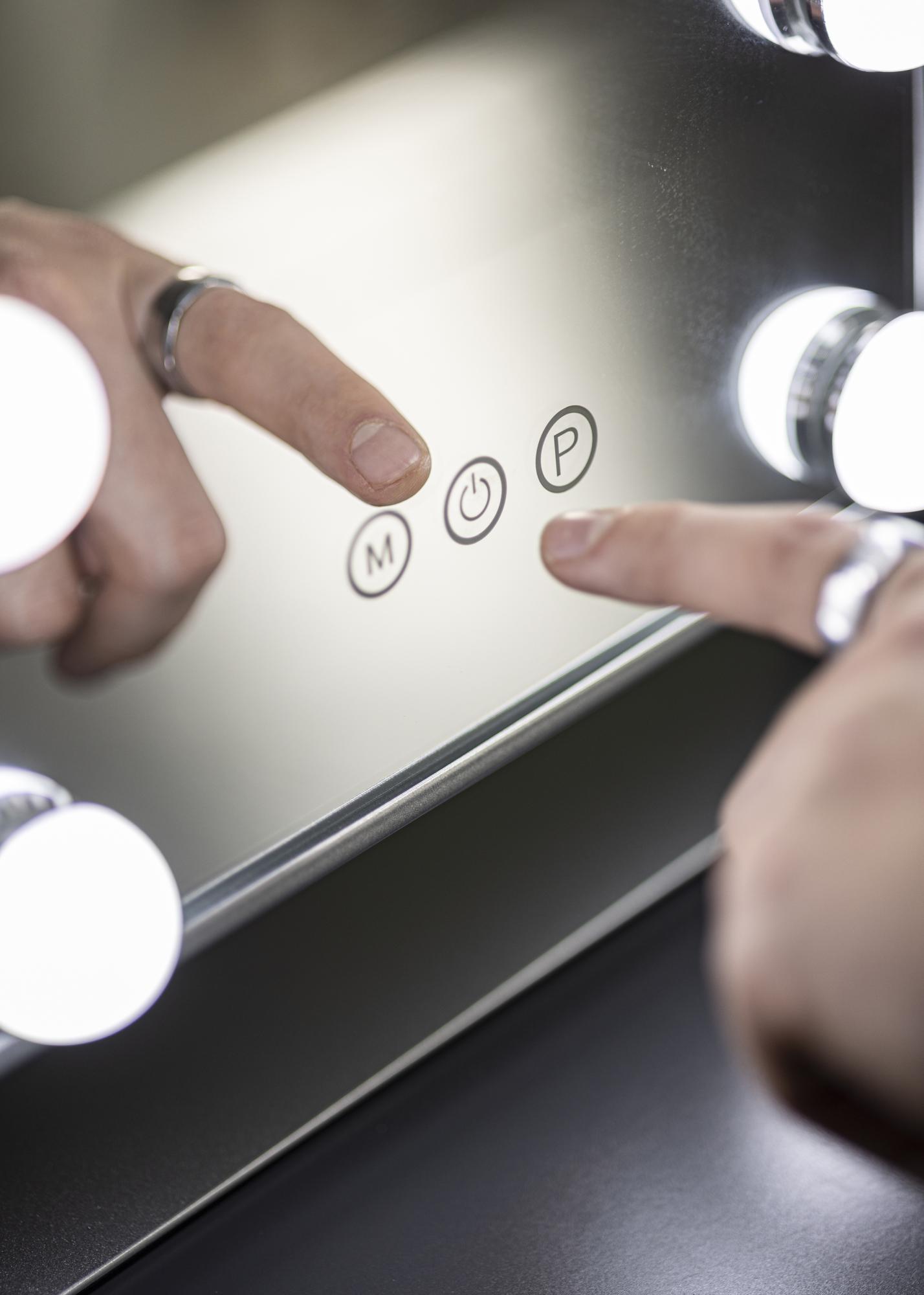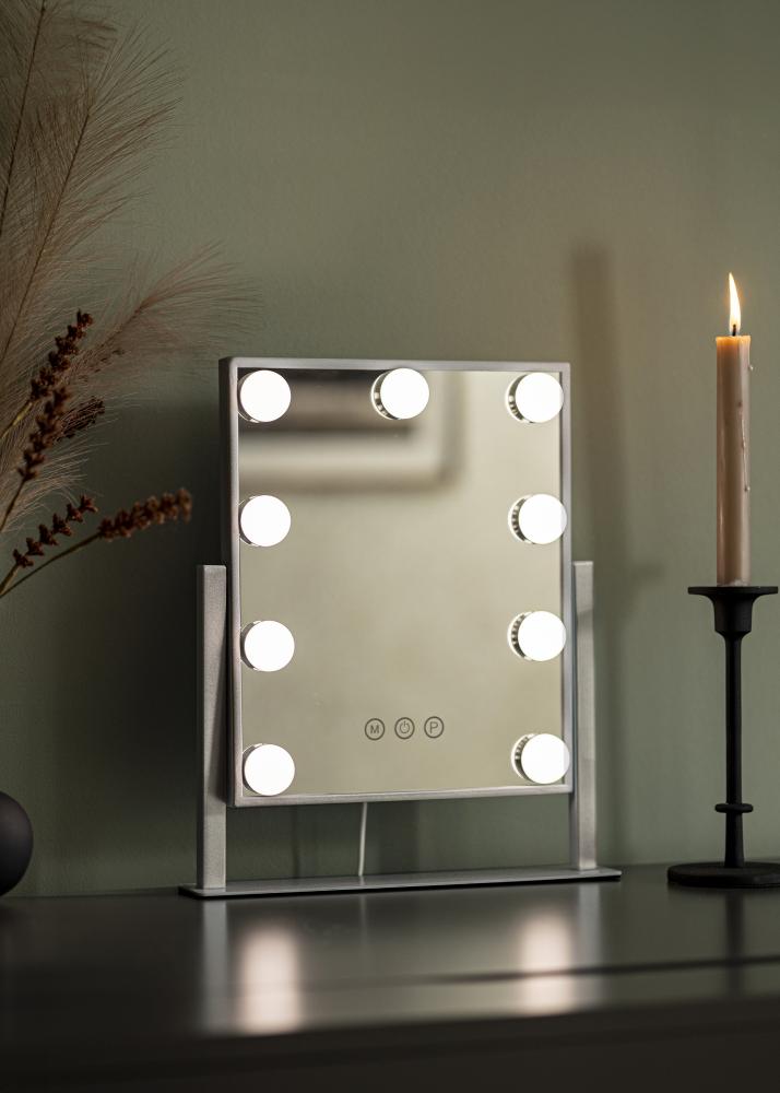 See meigipeegel leiab kindla koha sinu meiginurgas. Stiilset hõbedavärvi täiendab 9 LED-lampi, mis kaunilt ääristavad 25x30 cm suurust peegelpinda. LED-valgustus annab ühtlase valguse, kui sa meiki peale kannad, ja lisaks paindlikkusele saad seadistada värvitemperatuuri ja hämaruse valgustuse jaoks, et saavutada soovitud heledus. Valgustuse reguleerimiseks kasuta puutenuppe peegli esiküljel. "M" nupp reguleerib värvitemperatuuri ja sa saad valida sooja, külma ja loomuliku valguse vahel. "P" nupp kasutatakse heledusastme muutmiseks. Samuti on olemas sisse-/välja lüliti, et peegli valgust sisse ja välja lülitada.
