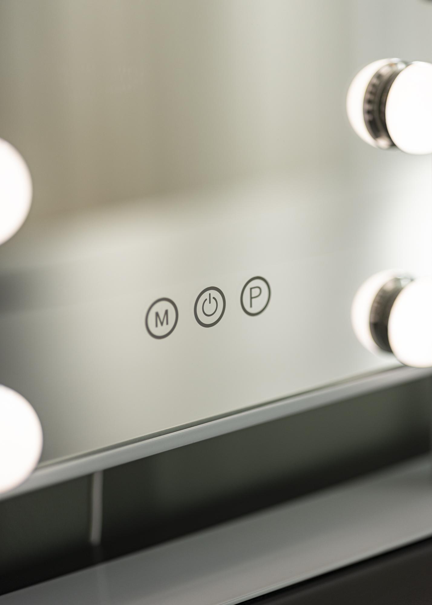 Valgustus lülitatakse sisse peegli esiküljel oleva puudutusnupuga. Samuti on olemas puutetundlikud nupud heledustaseme ja värvitemperatuuri reguleerimiseks, et saaksite valgust täpselt soovitud viisil seadistada. Nupp, millel on tähis "P", võimaldab teil valgust hämardada ja nupp, millel on tähis "M", võimaldab reguleerida valgustuse värvitemperatuuri. Peegel ühendatakse pistikuga.
