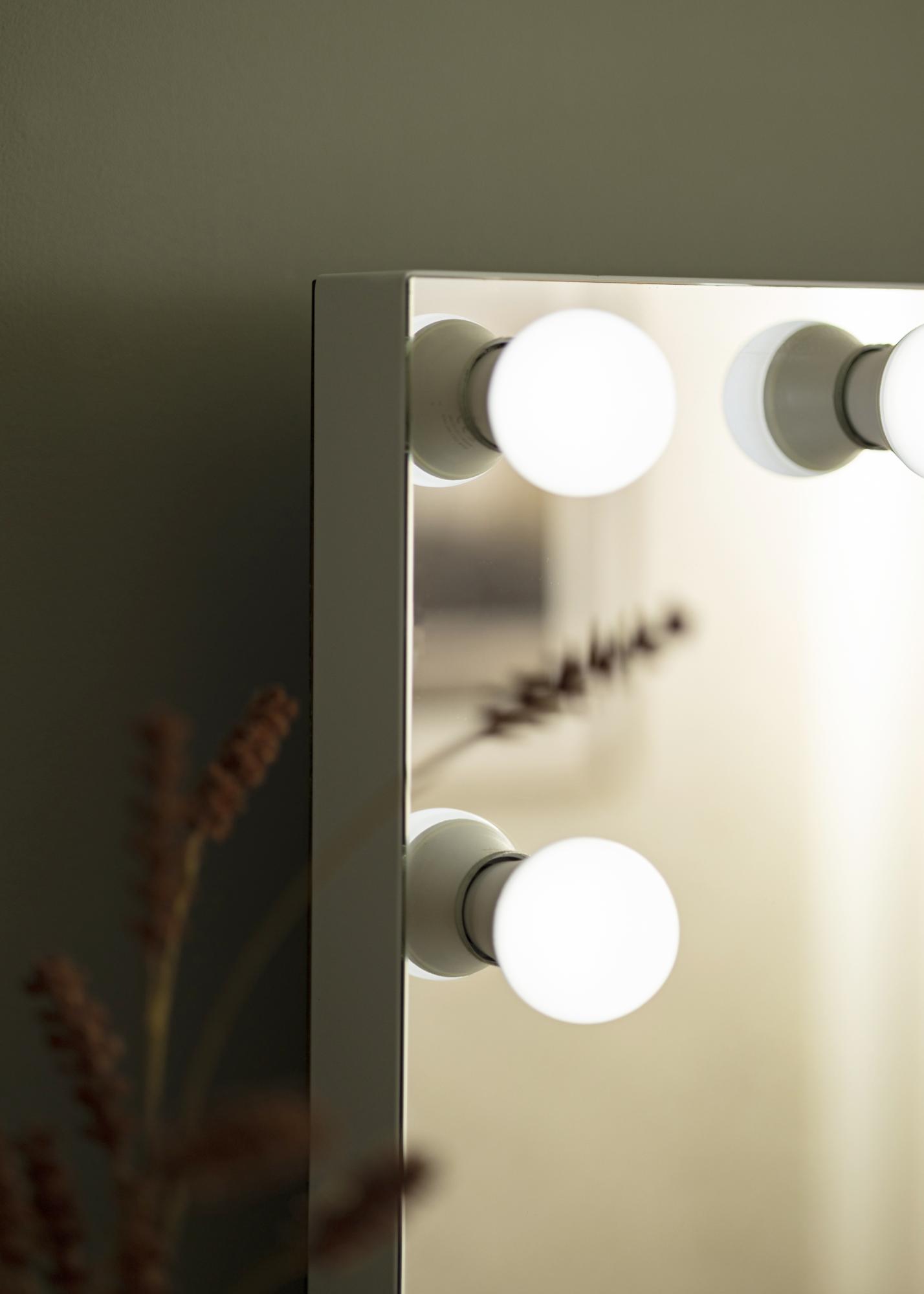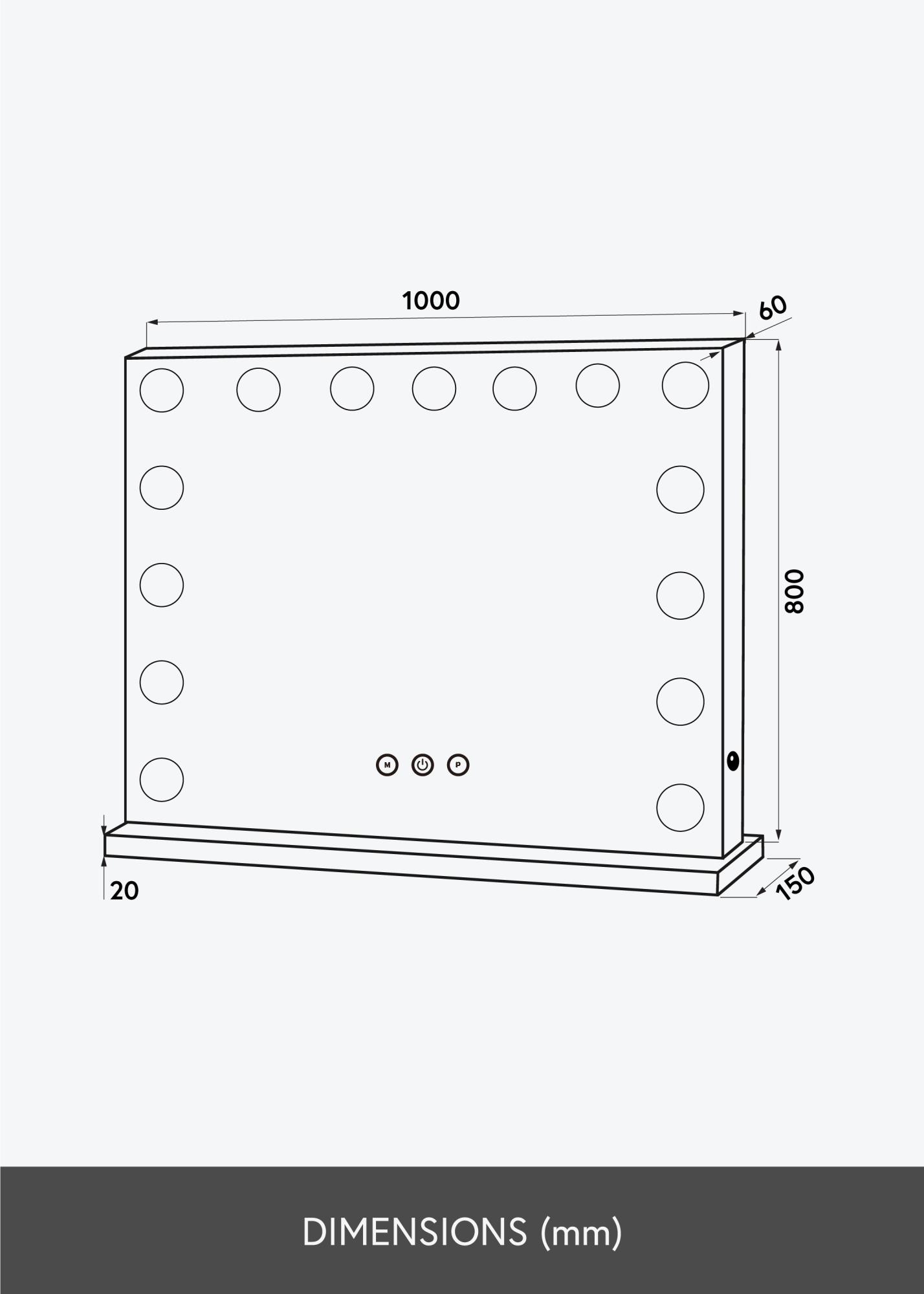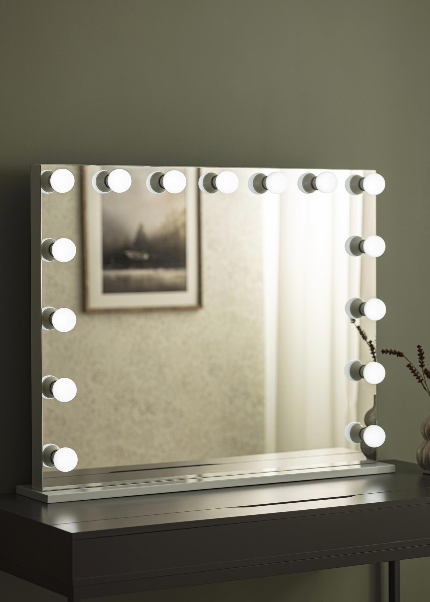 See Hollywoodi-stiilis meigipeegel lisab glamuur teie meiginurka. Disain annab luksusliku ilme tänu suurele peegelpinnale mõõtmetega 100x80 cm ja sisseehitatud valgustusele, mis koosneb 15 lambipirnist, mis ümbritsevad peegli servi. Lambipirnidel on E27 sokkel ja neid saab vajadusel välja vahetada. Peegel saab asetada püstiasendisse, mistõttu sobib see suurepäraselt kas kummutile magamistoas, elutoa kapi peale või mis tahes muusse ruumi, kus soovite stiilset peeglit. Kui soovite peegli üles seinale paigaldada, saab jaluse eemaldada.